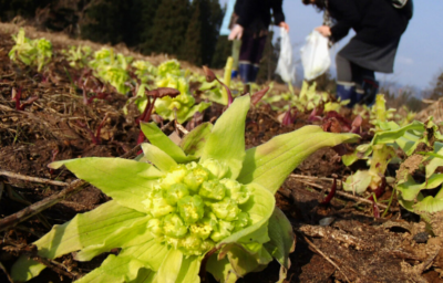 十日町市珠川の「あてま高原リゾートベルナティオ」にある「あてま森と水辺の教室 ポポラ」。4月は雪が解け始め、ふきのとうや…
