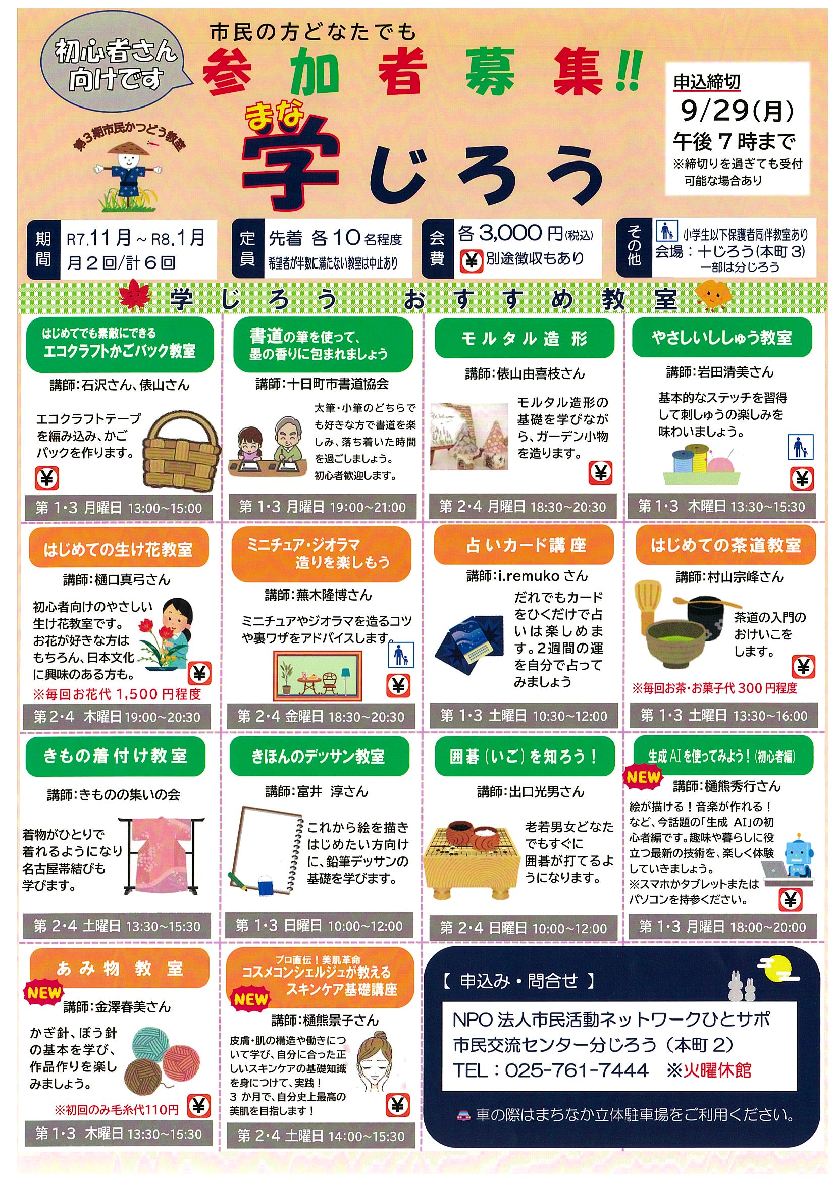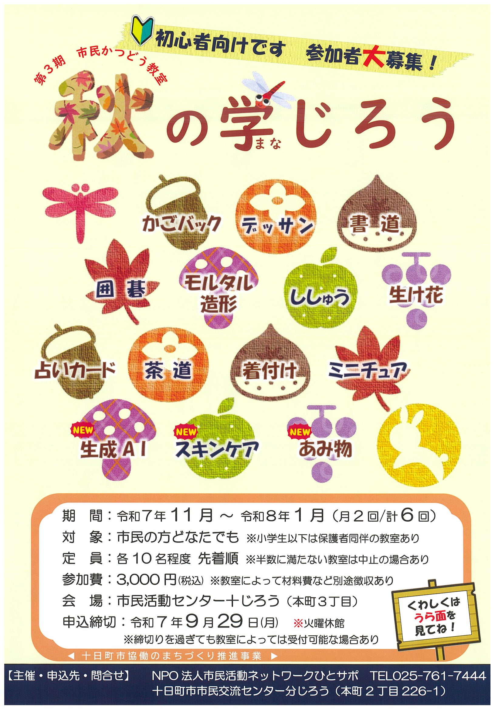 14の趣味の教室が11月から令和8年1月にかけて開催されます。月2回開催で計6回の開催となります。応募締切は9月29日(月)です。