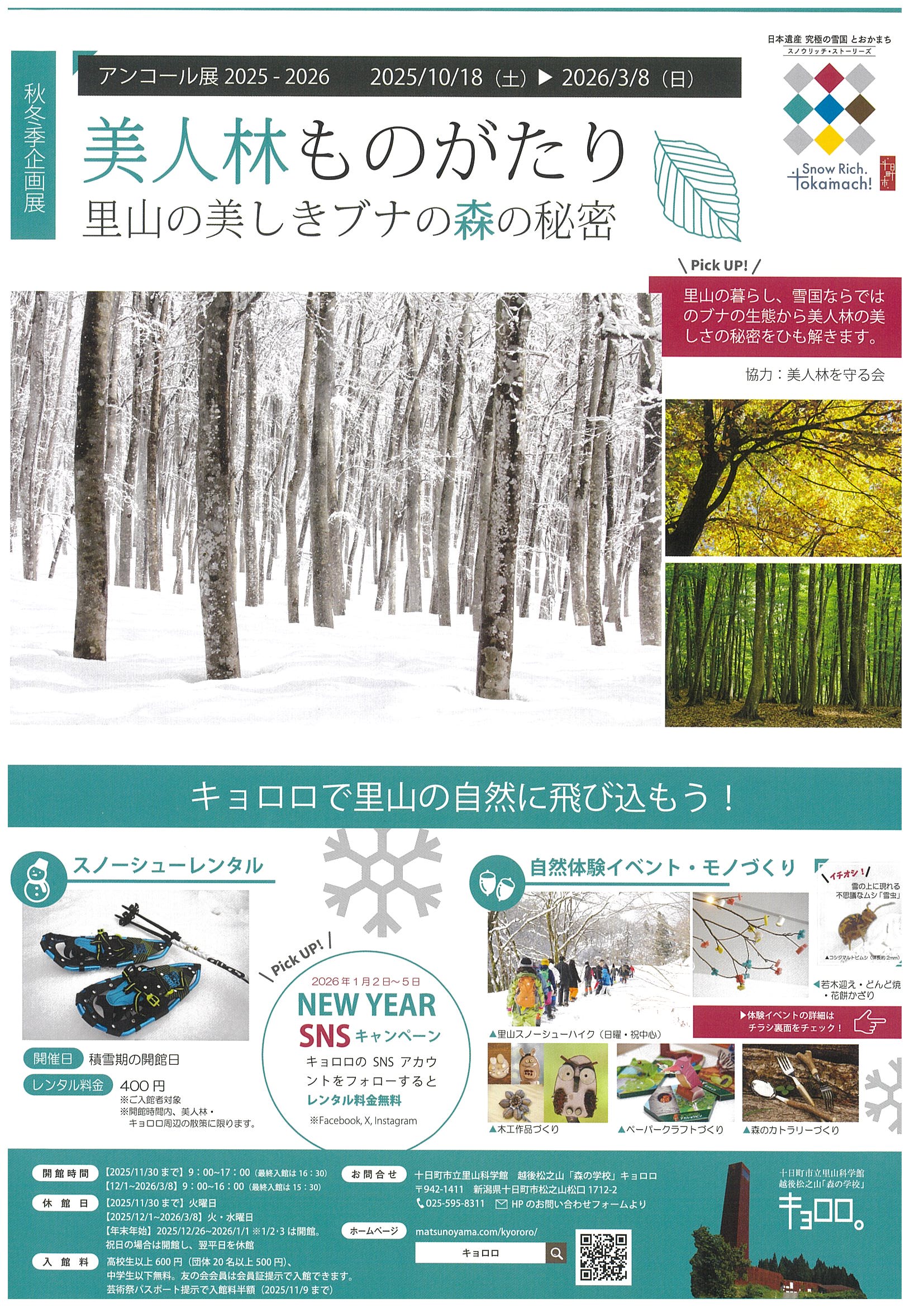 十日町市立里山科学館 越後松之山「森の学校」キョロロは、雪国の里山のど真ん中に位置する小さな科学館です。キョロロでは定期的にイベントを開催しています。詳しくは関連ページや公式HPをご覧ください。