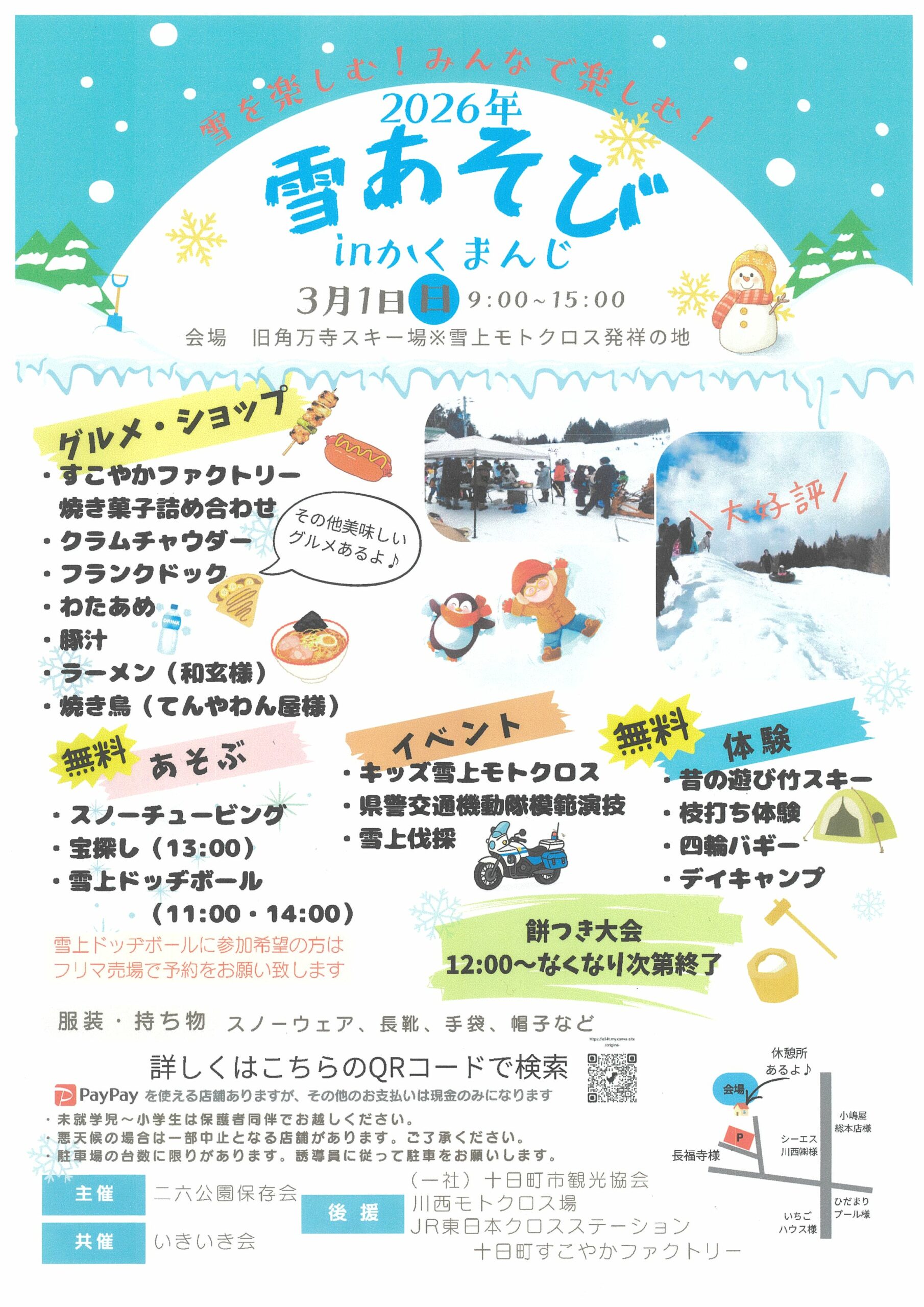 内容:雪のごっつぉ村(屋台)、福まき、雪上レクリエーション、小学生発表 等