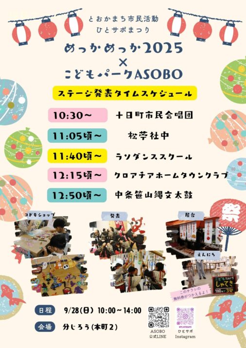 十日町市で活動をしている30を超える市民活動団体が一堂に集まります。『あなたのやりたかったことや、知りたかったことがここに来るとめっかる(見つかる)かも!』をコンセプトにしているイベントで、今回は毎月行われている「こどもパークASOBO」と同時開催です。「中条笹山縄文太鼓」や「ラソダンススクール」によるステージ発表の他、ワークショップや屋台・縁日など、子どもたちも楽しめる内容となっています。