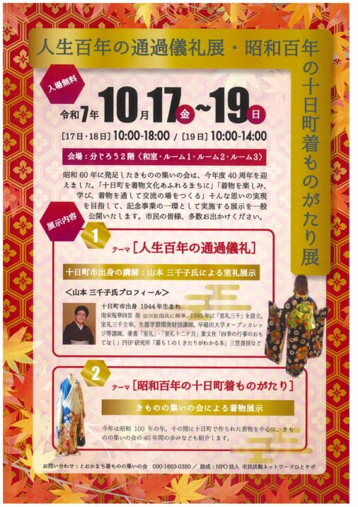 「人生百年の通過儀礼展・昭和百年の十日町着ものがたり展」が10月17日(金)~19日(日)まで十日町市市民交流センター分じろうで開催されます。