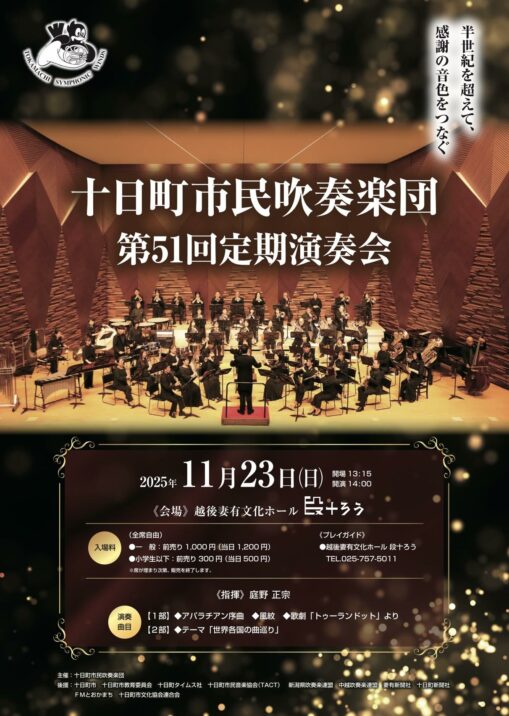 十日町市民吹奏楽団は11/23(日)に越後妻有文化ホール段十ろうで第51回定期演奏会を開催します。