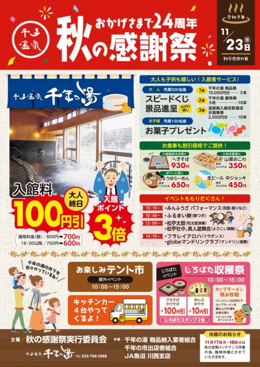 千手温泉千年の湯が24周年秋の感謝祭を11月23日(日)に開催します。