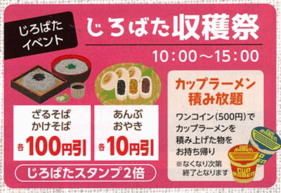 また、「千年の市じろばた」前でも収穫祭が行われ、1回500円でカップラーメン積み放題などの催しが行われます。なお、当日は千手温泉千年の湯の入館料が大人100円引きになり、入館者先着500名ははずれ無しのくじ引きを引くことができます。1等は千年の湯商品券1万円分です。