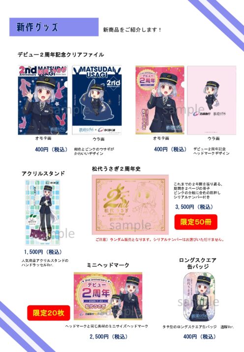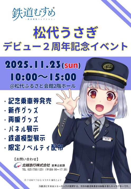 「鉄道むすめ」はトミーテックが展開する全国の鉄道事業者の制服を着たキャラクターで、松代うさぎもその中の1人です。イベントではデビュー2周年記念乗車券の発売や松代うさぎの新作グッズの販売、等身大パネルの展示など、盛りだくさんの内容となっています。また来場者先着200名には限定ノベルティの配布が12:00から予定されています。