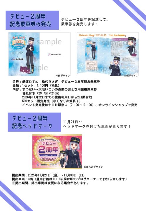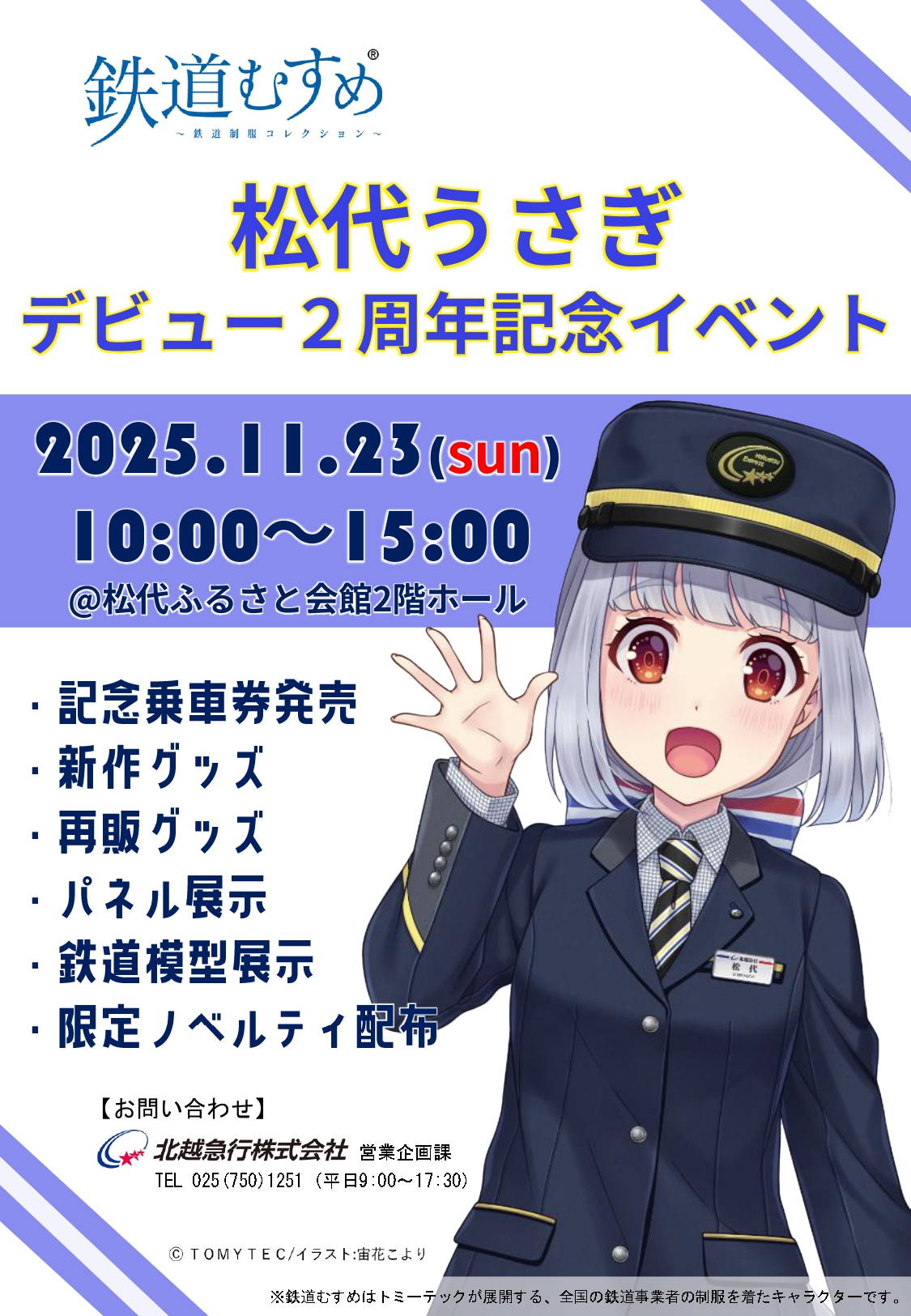 北越急行株式会社は、「鉄道むすめ」のキャラクター「松代うさぎ」のデビュー2周年を記念したイベントを23日(日)に松代ふるさと会館で開催します。
