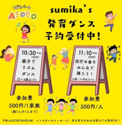 またこの日はダンスのワークショップも開催されます。ワークショップを開催するsumika’s発育ダンスは、市内で2歳から7歳の子どもを対象に活動しているダンス教室です。現在参加者を募集しています。申し込みはこどもパークASOBOの公式LINEまたはインスタグラムのメッセージ投稿で受付ています。