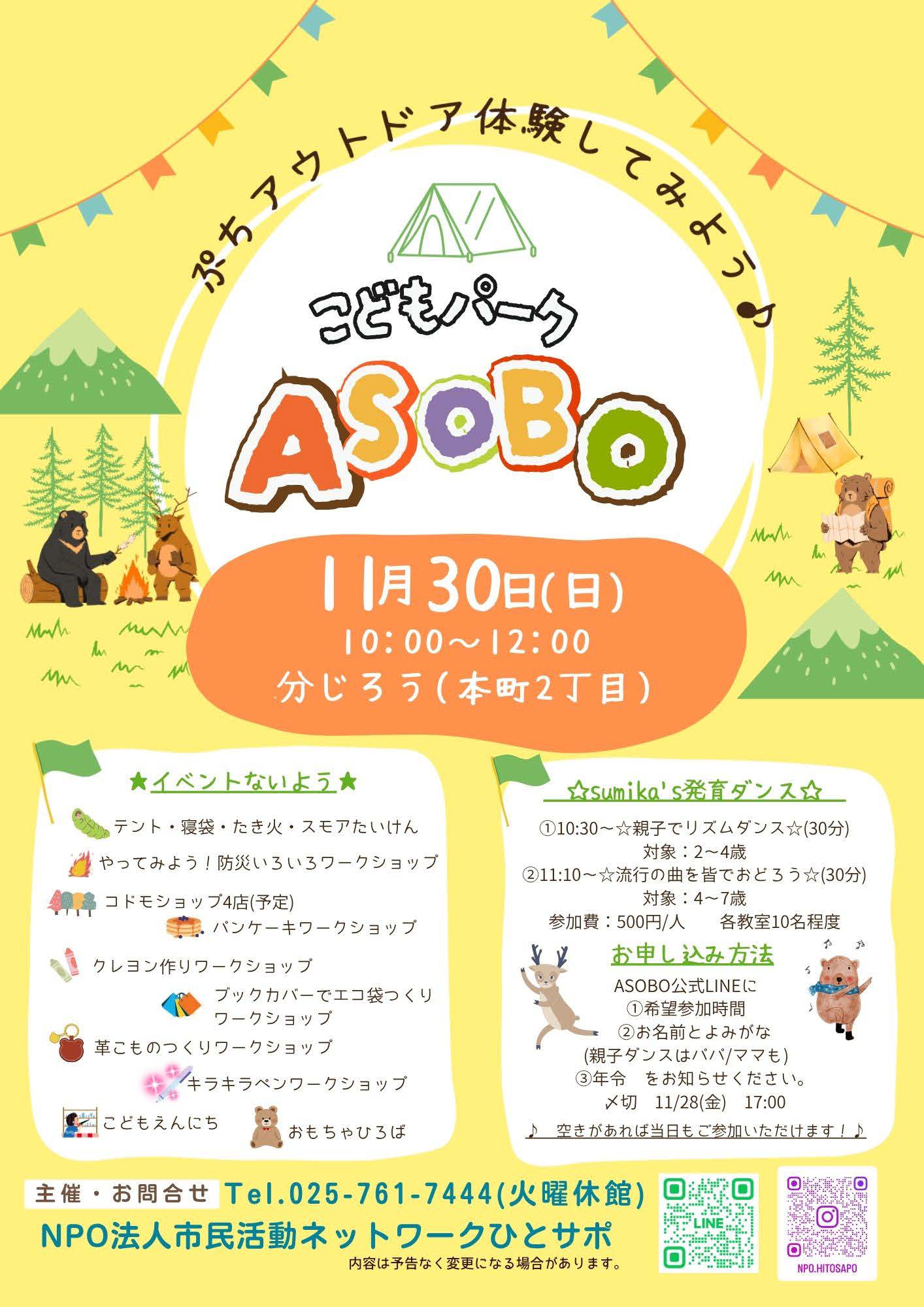 毎月最終日曜日に行われているこどもパークASOBO。今回は11月30日(日)に「ぷちアウトドア体験&ぼうさい体験」をテーマに開催します。
