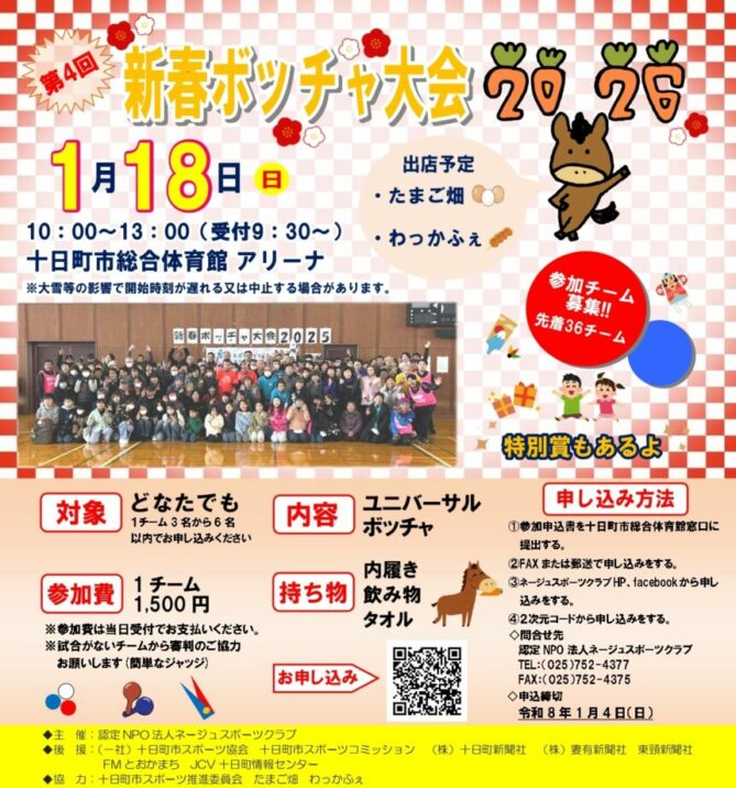 十日町市総合体育館で「新春ボッチャ大会2026」が1月18日(日)に開催されます。認定NPO法人ネージュスポーツクラブでは参加チームを募集しています。