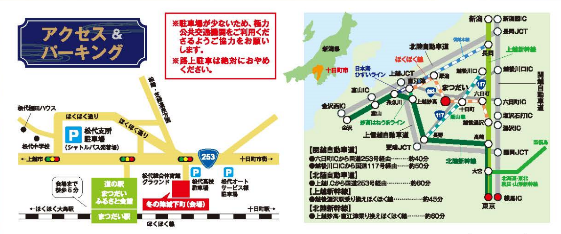 駐車場に限りがあるため、車でお越しの方は指定の駐車場に停めるほか、できるだけ公共交通機関を利用するよう越後まつだい冬の陣実行委員会では呼びかけています。