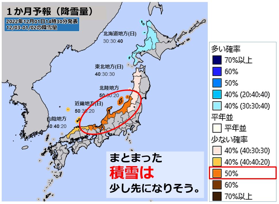 気象庁は1日に1か月予報を発表しました。ご覧の予報は3日から1月2日までの降雪量の1か月予報です。北陸地方の降雪量は平年よりも少ない確率が50%と高くなっています。先週もお伝えしましたが12月は寒気が入っても一時的で、長続きしない傾向に変わりはなさそうです。平野部でまとまった積雪となるのはもう少し先になりそうです。