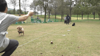 これは「恋・来いゲーム」です。犬と飼い主が20m離れて、間に置かれたおやつやおもちゃの誘惑に負けず、どれだけ早く飼い主の元にたどり着けるかを競います。