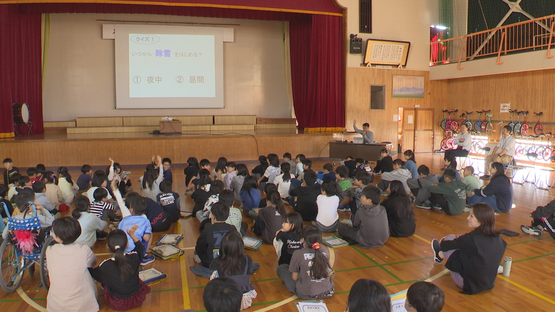 この出前授業は子どもたちに地域の暮らしを守る除雪作業の重要性ややりがいを知ってもらい、担い手不足の解消につなげようと十日町地域振興局が開きました。千手小学校の全校児童89人が参加し、はじめに体育館で除雪車の種類や、作業を行っている時間帯や手順など道路除雪にまつわる知識を振興局の職員から学びました。