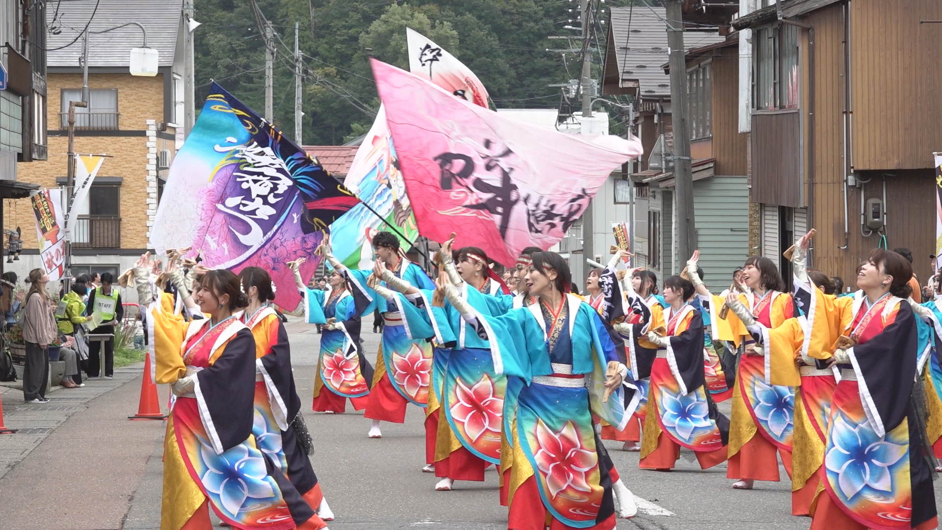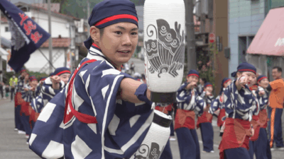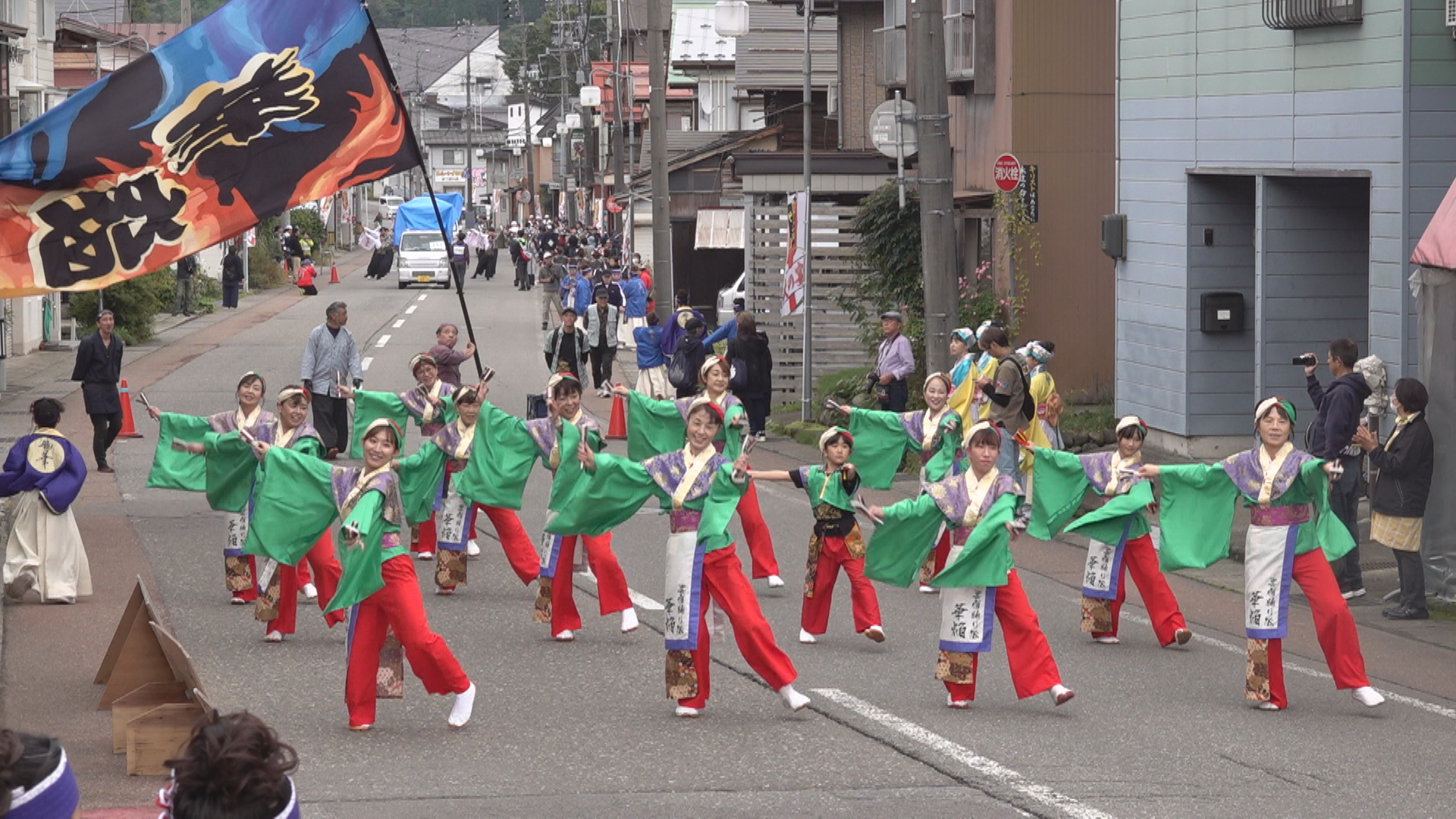 また県外からは、埼玉県のチーム「上總組」が総勢80人で息の合った演舞を披露したほか、富山県から参加した「Rey華繚乱」は全長3mの旗を4本振り回す盛大なパフォーマンスで観客を魅了しました。