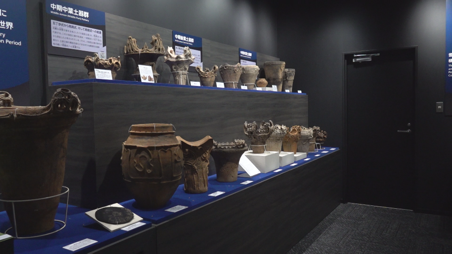 2階の展示室には、堂平遺跡から出土した国重要文化財の火焔型土器や王冠型土器をはじめ、津南町で見つかった約2200点の資料がパネルと共に時代や種類ごとに区切って展示されています。