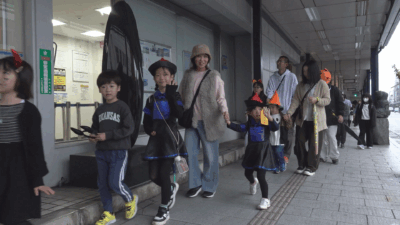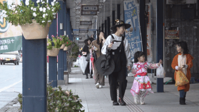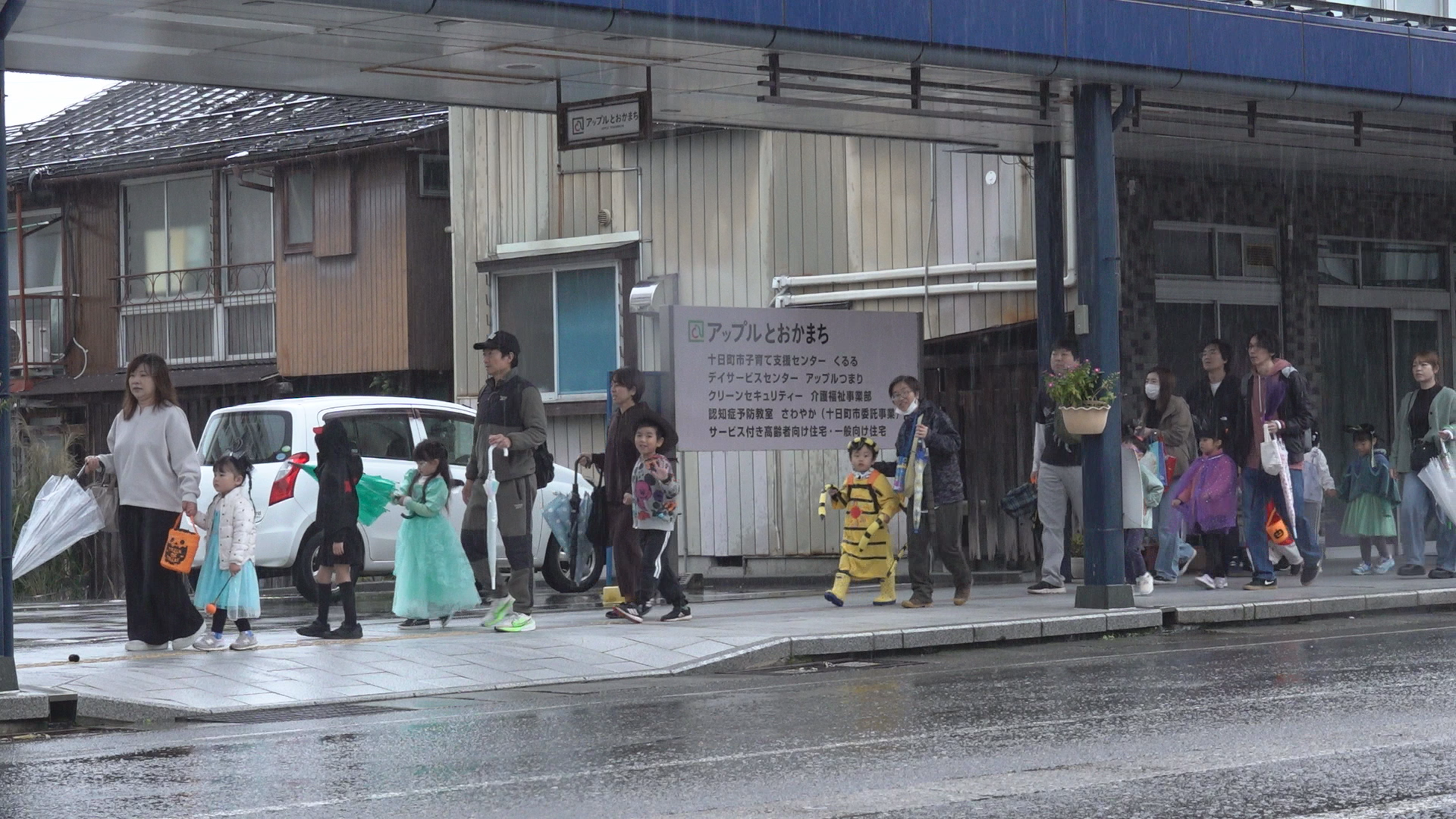 「まちなかハロウィン大行進」は今回が通算4回目で、総勢350人の子どもたちが参加しました。行進は二手に分かれて分じろうを中心に往復約1kmを、子どもたちはお姫様やキョンシーなど思い思いの衣装に身を包み、本町通りを賑わせました。