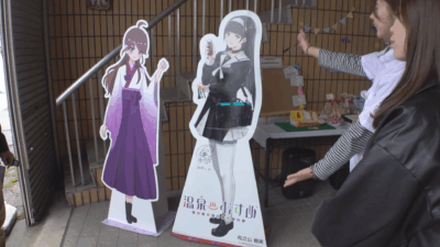この「まつむすめ」を擬人化した5人のオリジナルキャラクターにする企画が去年から進められ、今回ようやく、キャラクター1人のパネルが完成し、松之山温泉の温泉むすめ「松之山棚美」と並んで訪れた人を出迎えました。