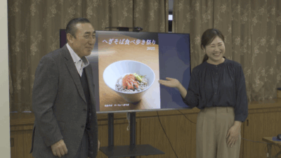 実行委員会は17日(月)に記者会見を開いて、食べ歩き祭りの趣旨を説明しました。今回の企画にあたってはフリージャーナリストで、30年以上ソバの研究やプロデュースをしている片山虎之介さんがアドバイザーとして係わっています。片山さんは参加店にサーモンやいくら、アボカドのトッピングなど、これまでのへぎそばに無かったような斬新なレシピを提案しました。