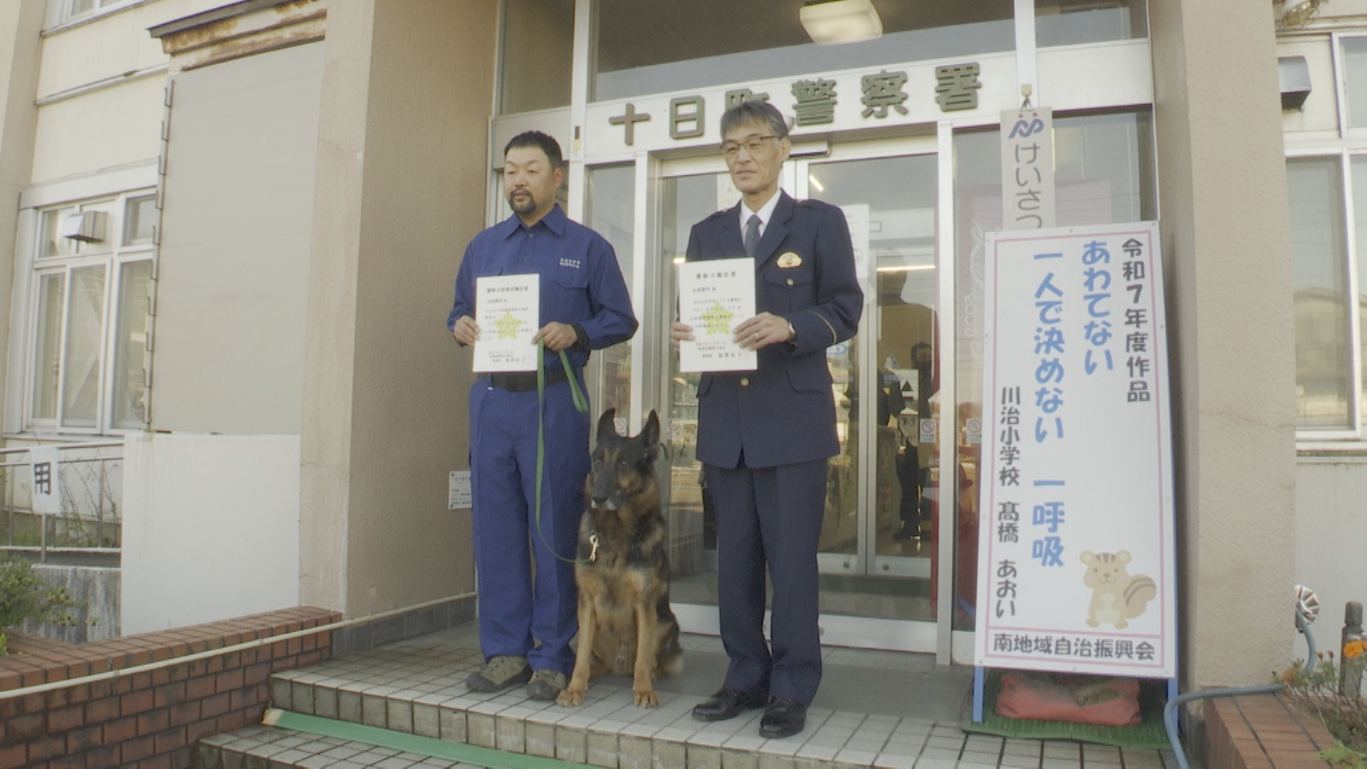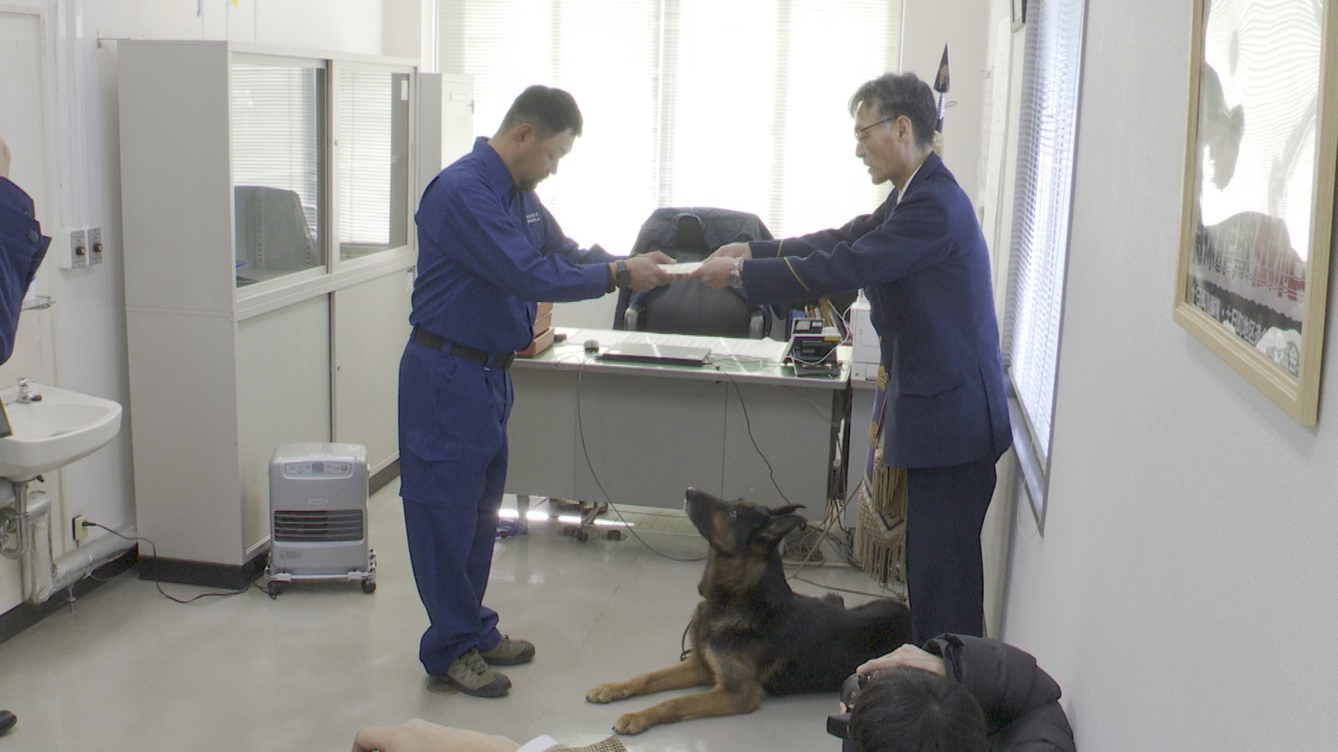 この日は飼い主で訓練士の水落憲明さんとアロー号に十日町警察署で山崎署長から委託書が手渡されました。