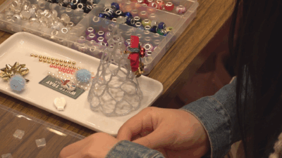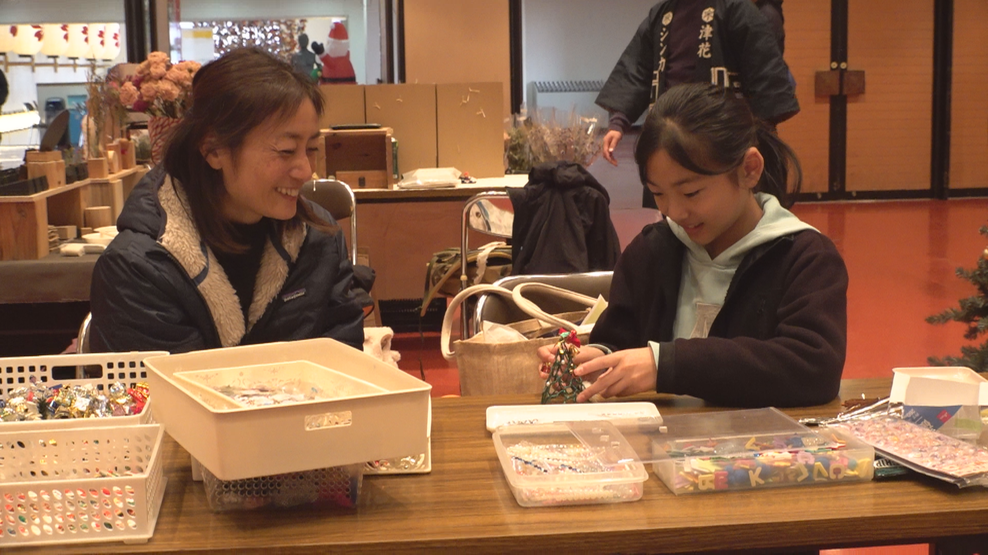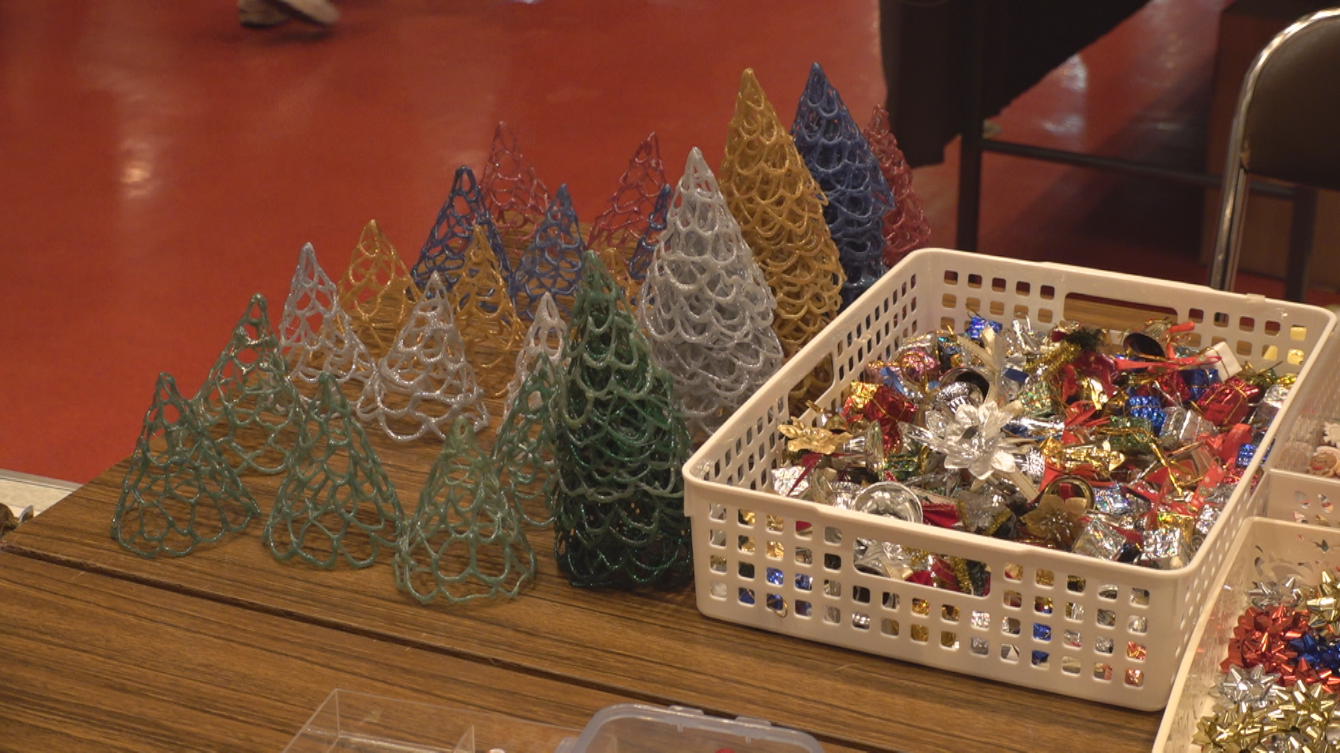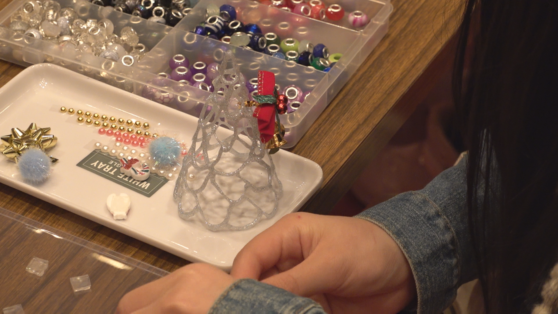 フリーマーケットでは、樹脂でもみの木の形をかたどった高さ10cmほどの「ヌードツリー」にオーナメントやシールを飾ってクリスマスツリーを作るワークショップが人気を集めていました。