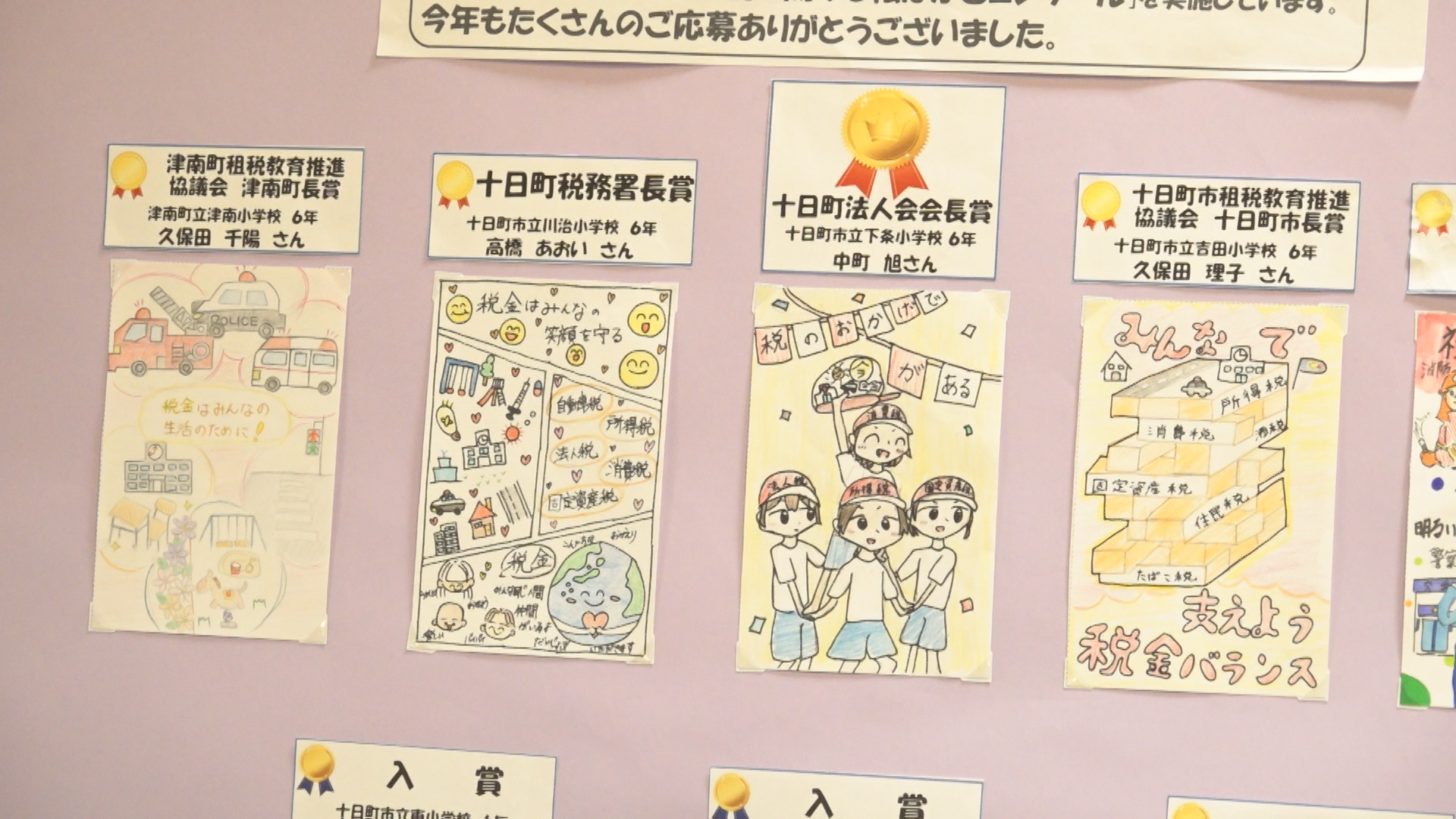 また税の標語では小中学生10人、税に関する絵はがきコンクールでは11人の小学生が入賞しました。