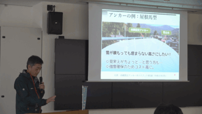 上村教授は転落事故を防ぐには命綱を付けることが重要と話し、命綱を結びつけて固定するために屋根に設置するアンカーについて、製品の種類や使い方などを詳しく紹介しました。