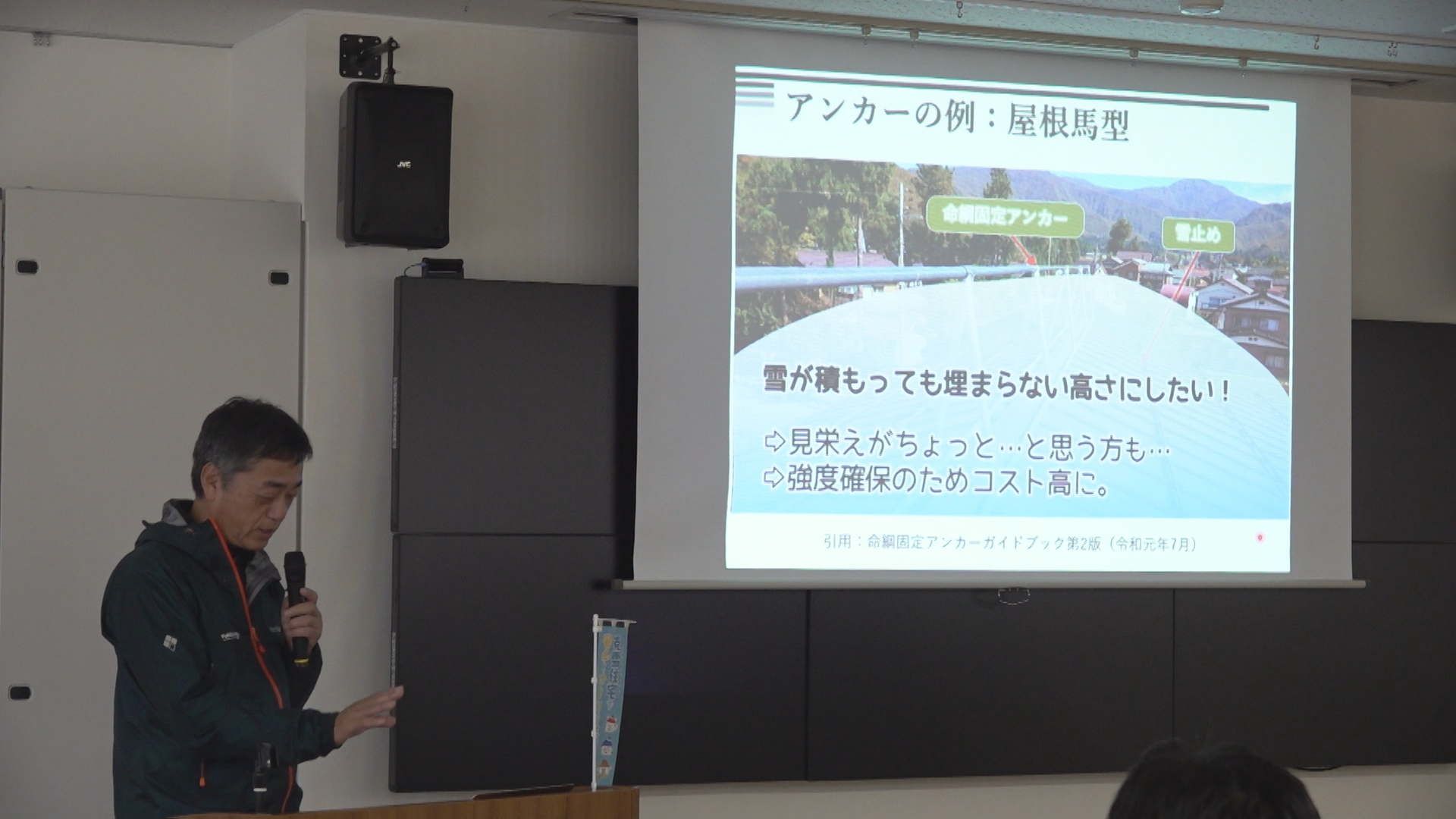 「転落防止の対策は実は命綱しかない。命綱と結ぶ場所がなければほぼ意味がない。屋根に『アンカー』を付けていただくというのが安全対策の第一歩となる。自分では除雪ができない人が業者に頼むうえでも、アンカーがなければお断りするケースも出ている。そういった場合も含めてアンカーの設置を検討してほしい」