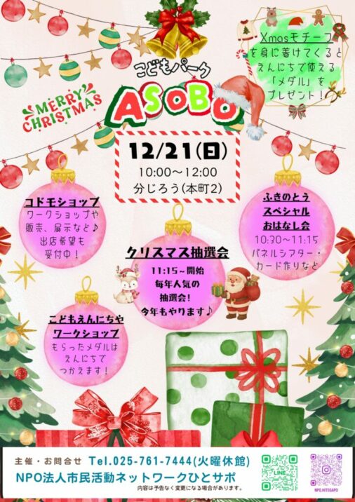 毎月最終日曜日に行われているこどもパークASOBO。今回は12月21日(日)に「クリスマス」をテーマに開催します。