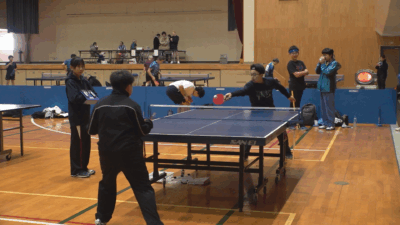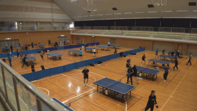 今年は地元のシニアチームをはじめ、長岡市や柏崎市など市外の卓球チームも参加し、総勢60人が集まりました。参加者たちは硬式球のグループと、通常より直径が4㎜大きいシニア向けの球を使う「ラージボール」のグループに分かれて総当たり戦を行ったあと、年齢やグループの垣根を超えた交流試合を楽しみました。