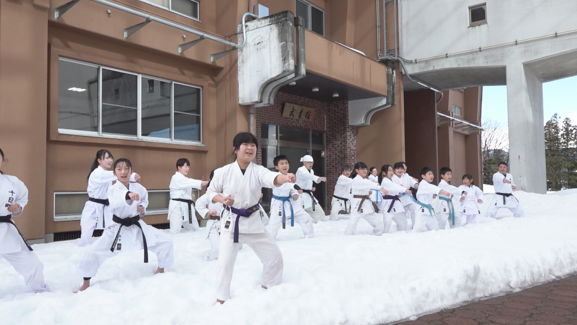 参加したのは小学1年生から70代までの約30人です。まず武道館の室内で「形」の稽古や模擬試合を行い、体を十分に温めたあと、はだしで外に出て雪の上で「突き」を10分間打ち続ける稽古に臨みました。