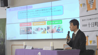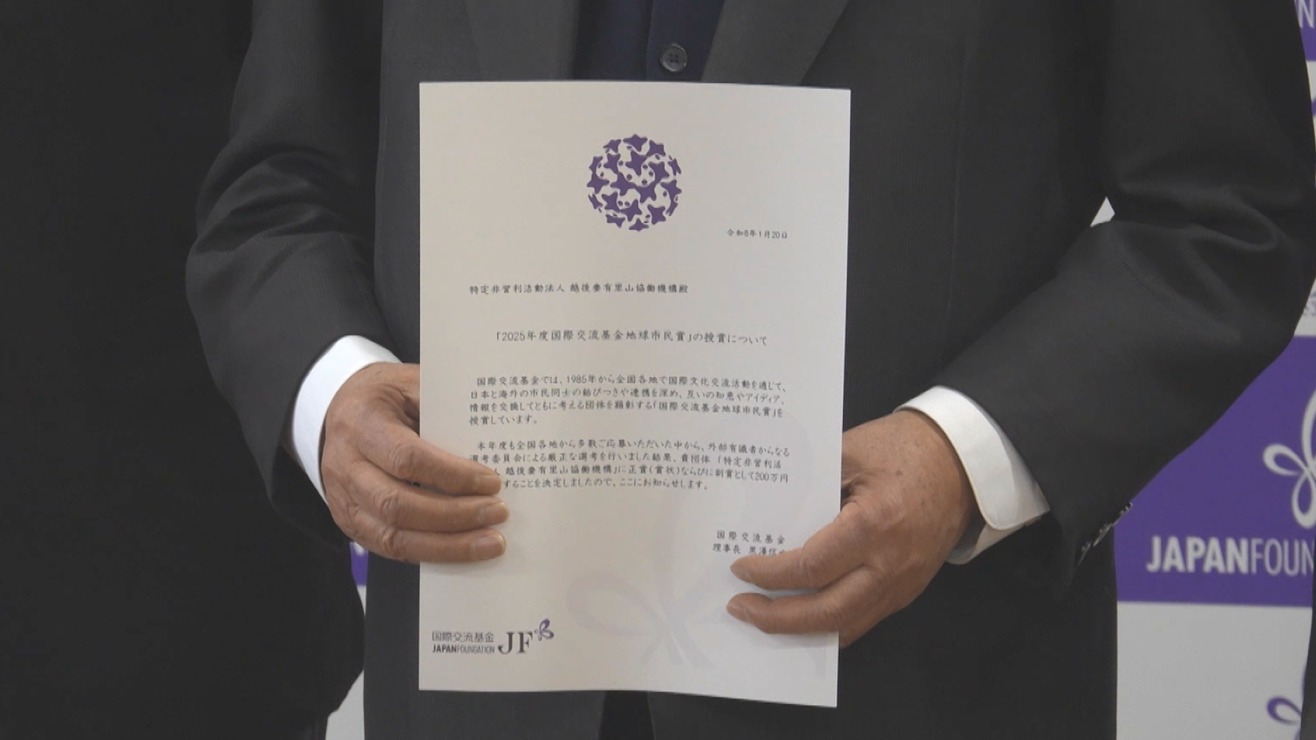 日本と海外の市民同士の交流を進めている団体を表彰する「国際交流基金地球市民賞」に新潟県では27年ぶり3団体目として十日町市のNPO法人里山協働機構が選ばれました。受賞理由に大地の芸術祭の取り組みのひとつ、多様な外国人を巻き込んだ「大地の運動会」が高く評価されました。
