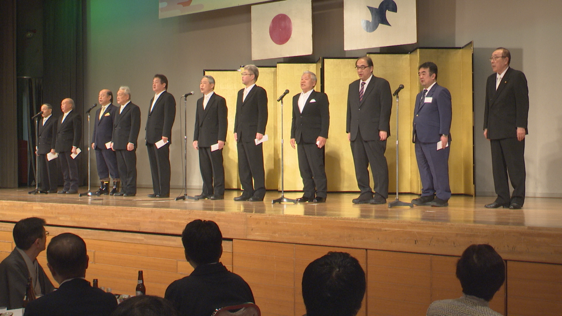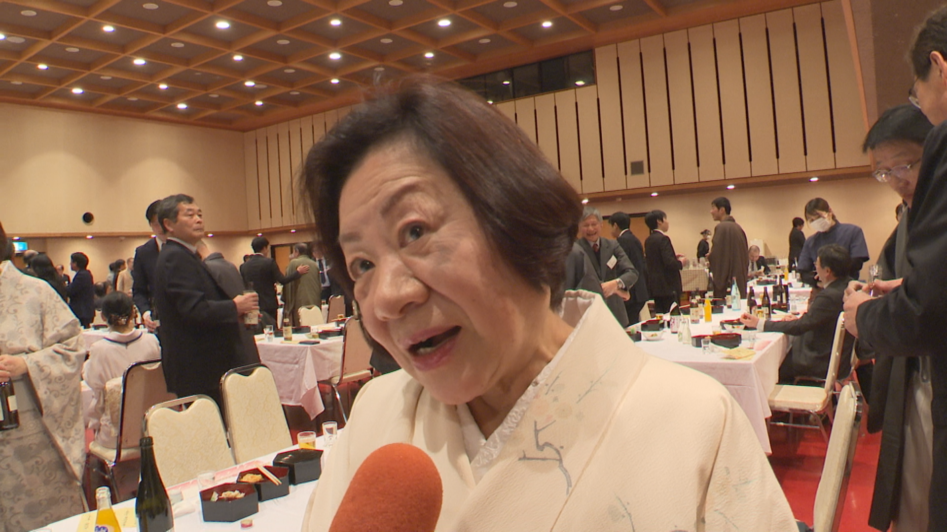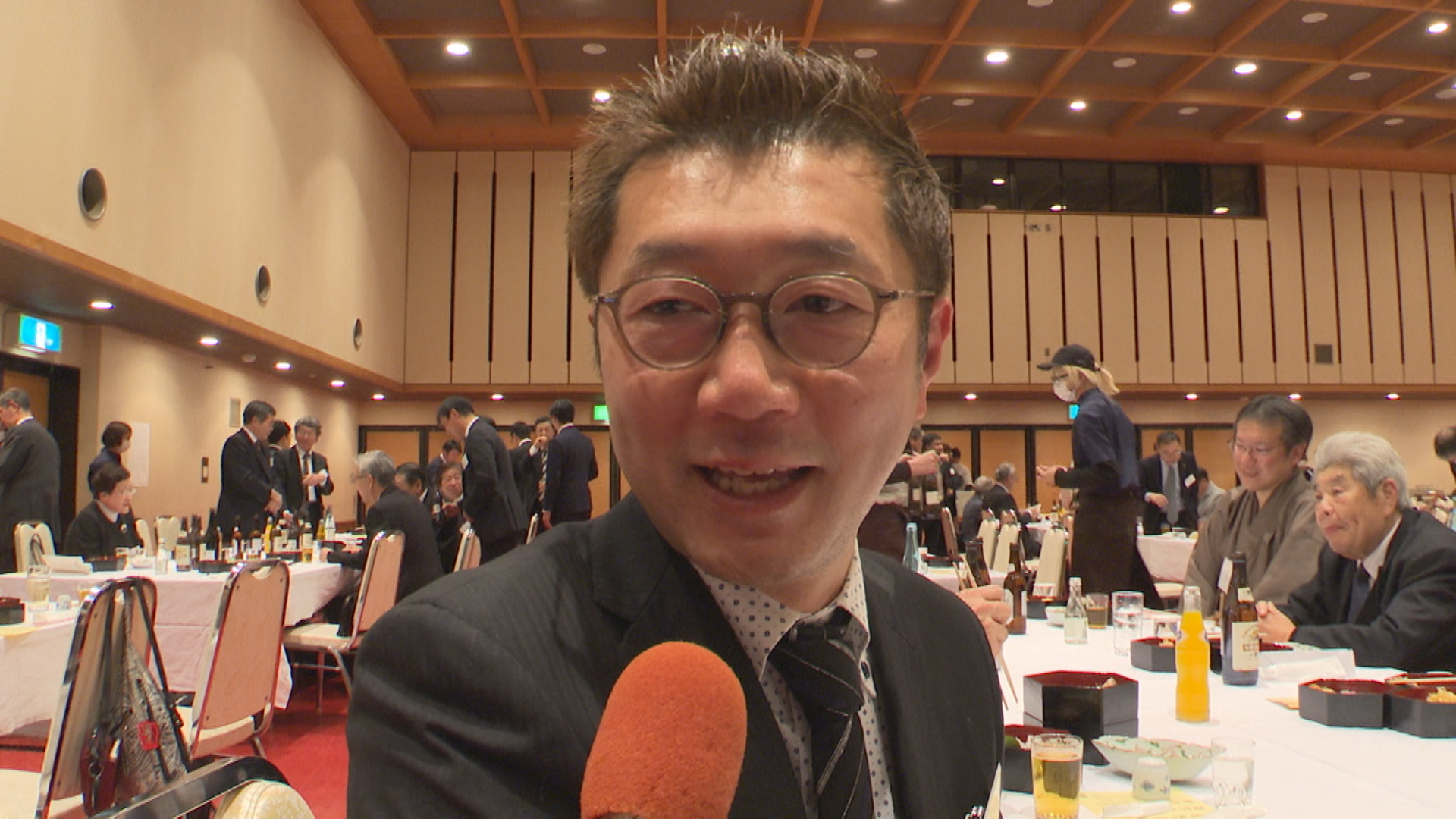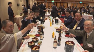 祝宴では詩吟の神風流神邑会による天神囃子のあと、参加者が名刺交換やあいさつを交わし、ことしの地域経済の展望を語り合っていました。
