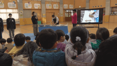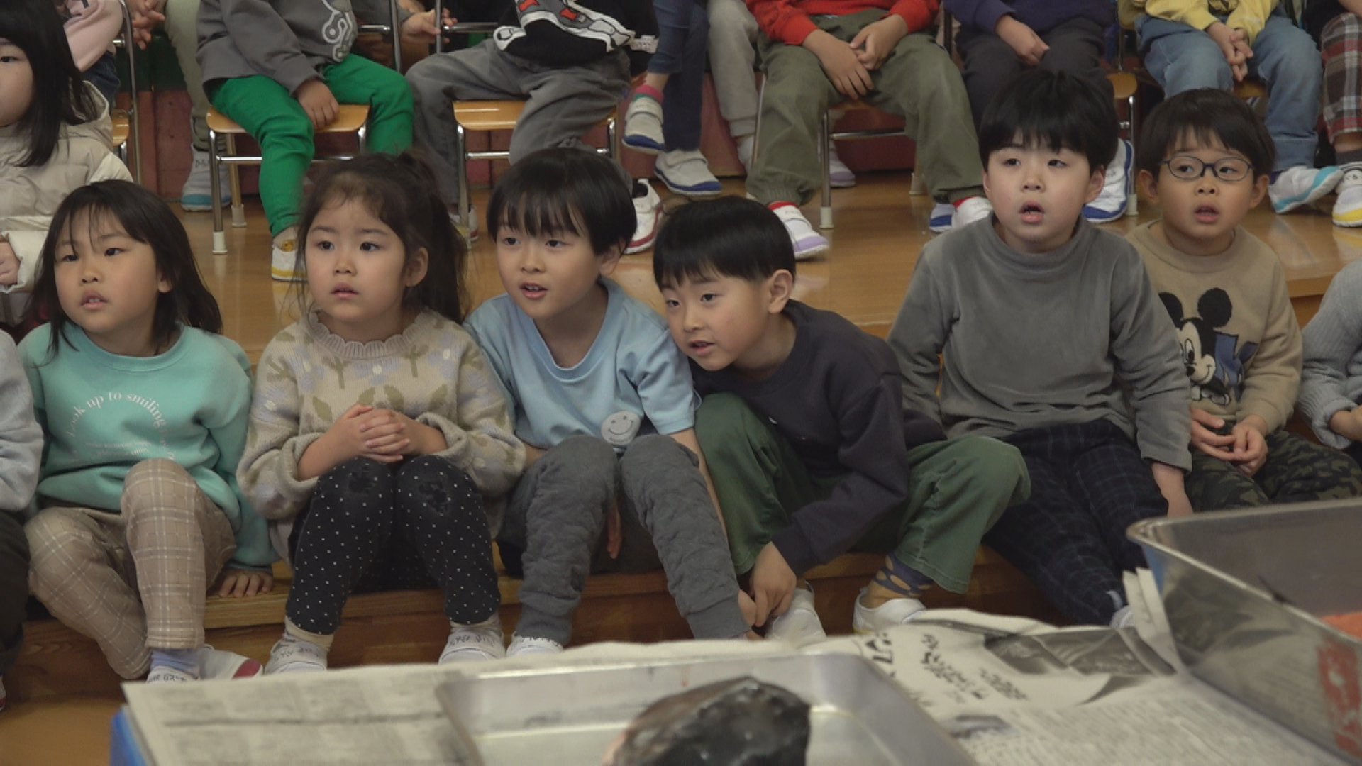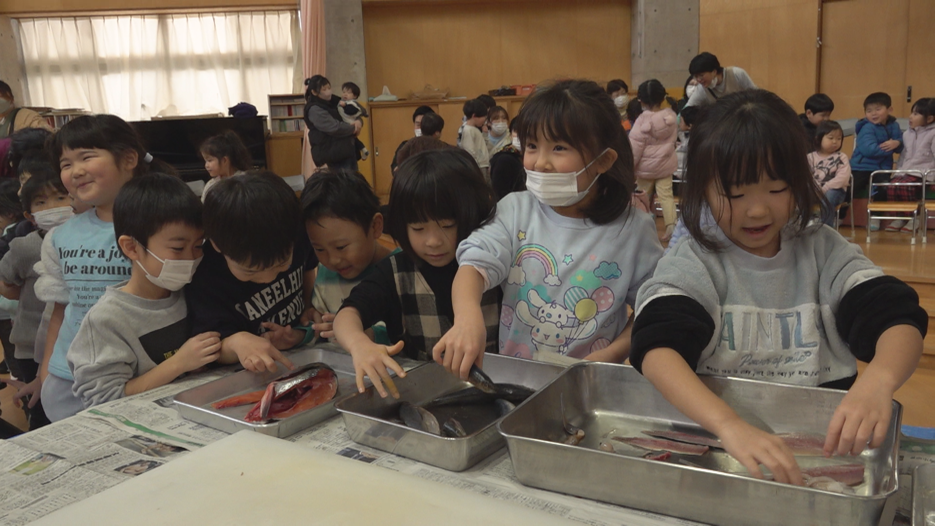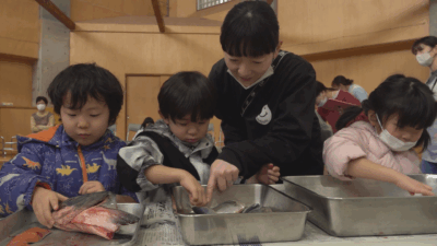 約100人の園児たちは実際にサケの表面に触ったり、匂いを確かめたあと、地元の割烹田町屋の店主、清水紀孝さんが包丁でサケを三枚に下ろし、切り身にする様子を真剣なまなざしで見守りました。