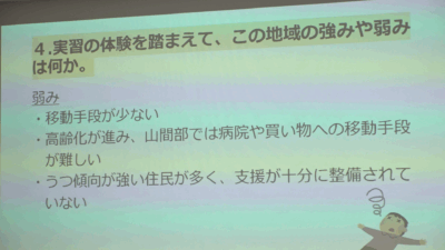 「高齢化の進む山間部は病院や買い物など、日常生活に必要な移動が難しい状況がある。これは受診理解や社会参加の減少から健康維持への課題になる可能性がある。移動手段の確保や精神的健康への支援整備が必要な地域だと感じた」