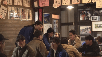 このイベントは地域活性化について学ぶ学生と連携して2015年から始まり、今年は國學院大学観光まちづくり学部の井門隆夫教授とゼミ生13人が運営に協力しています。この学生たちが松之山温泉の地炉で開く「学生居酒屋」は店内の飾り付けから料理やお酒を提供まですべて学生たちが行っています。