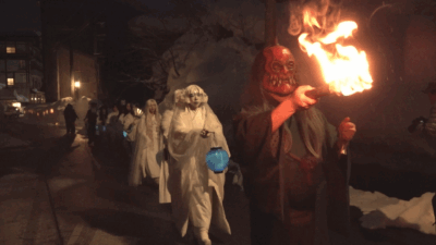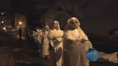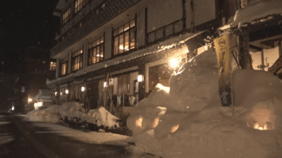 またイベント会場の松之山温泉街を盛り上げようと、今回初めて「雪女まつり」も催されました。雪女などの妖怪の姿に扮した11人が行列を作って練り歩き、湯けむりと雪あかり漂う松之山温泉街を幻想的な雰囲気に誘いました。
