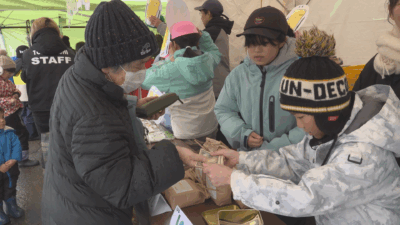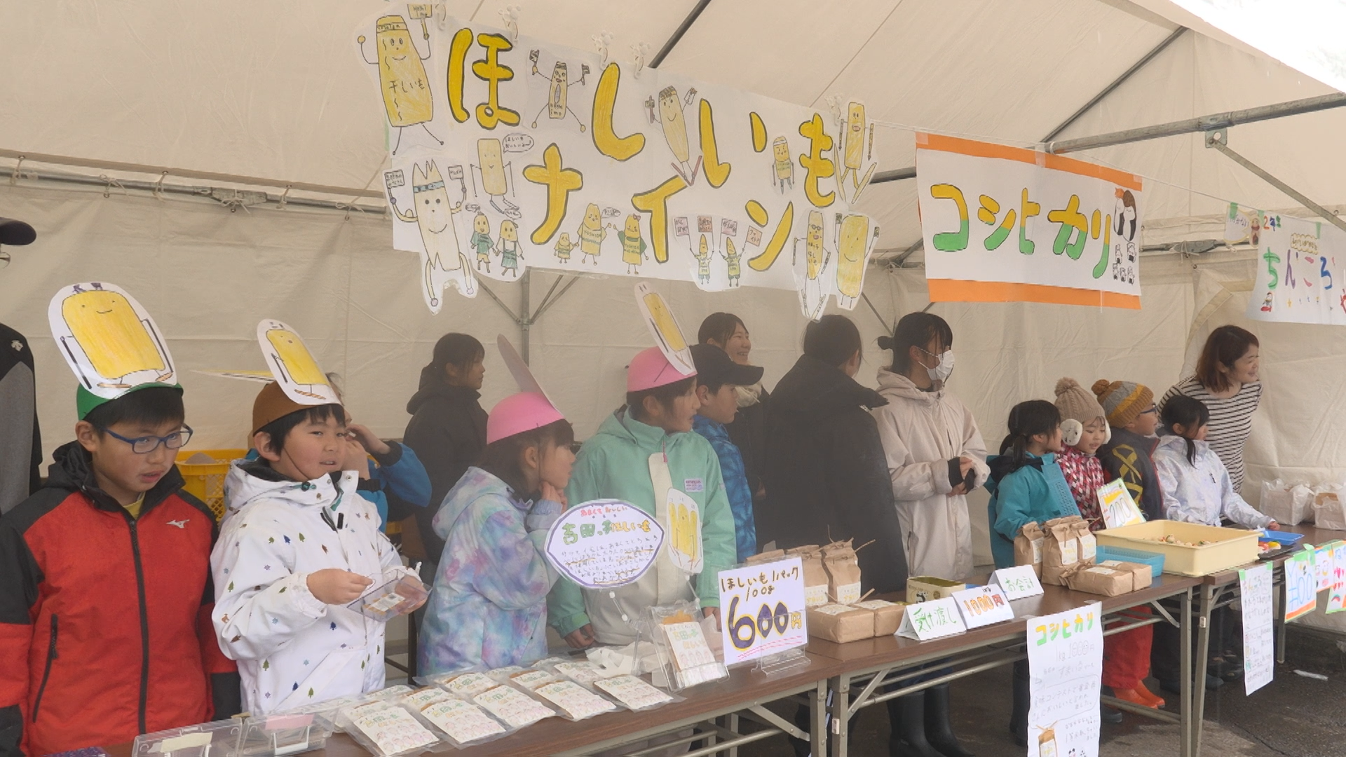 今回児童たちが販売を行ったのは6日(金)に吉田クロスカントリー競技場で行われたスキーのインターハイ会場です。テントには児童手作りの看板やポップを並べ、1・2年生は収穫したコシヒカリの米粉を使って作った「ちんころ」を100個、3・4年生はサツマイモを使った「干しいも」を140個、5・6年生は1㎏の「1等米コシヒカリ」100袋を、元気なかけ声と共に手売りしていきました。
