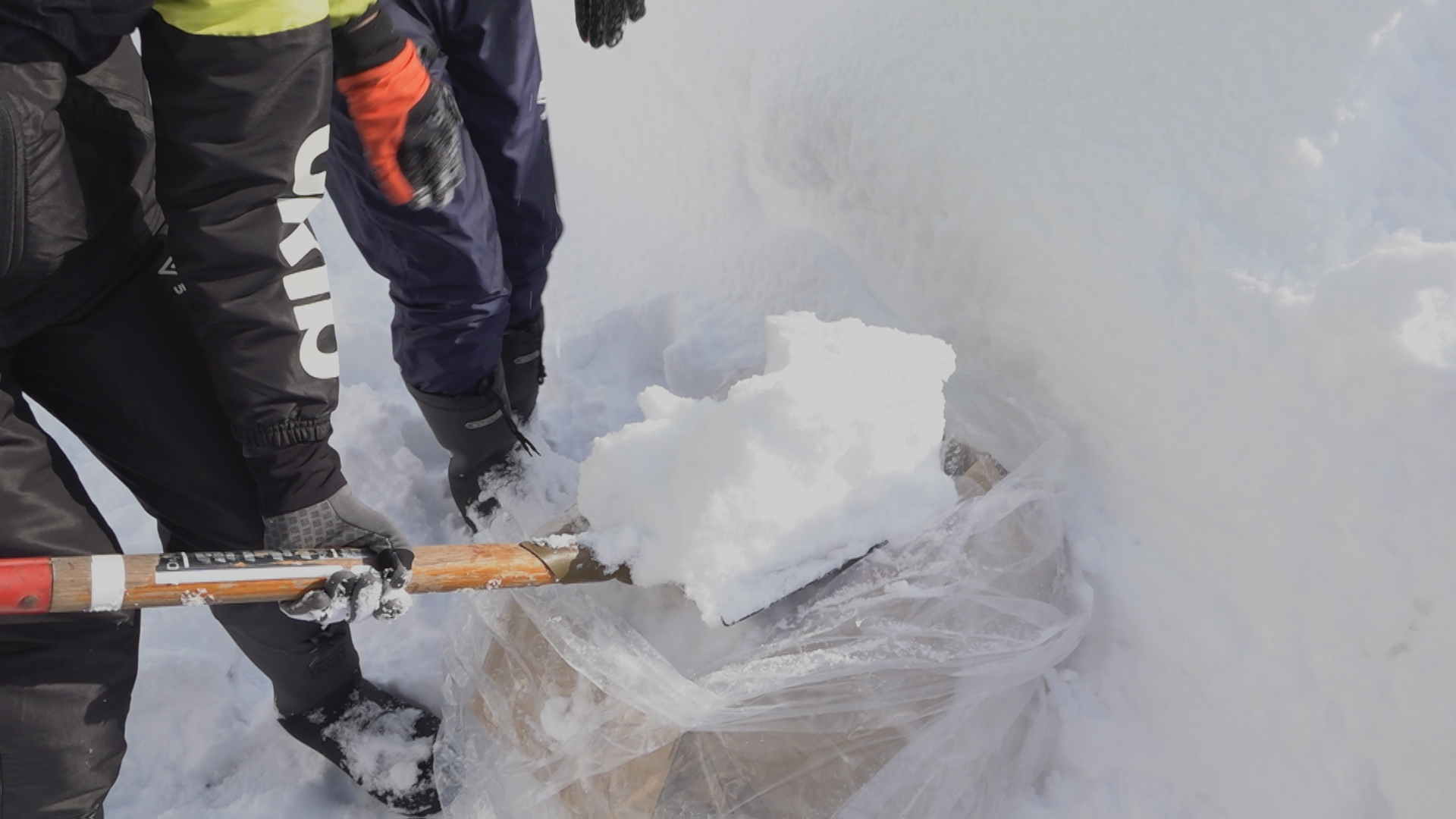 この日は6年生26人が10班に分かれて校舎脇に積もっていた新雪を段ボール一箱ずつに詰め、合計70㎏ほどの雪を用意しました。