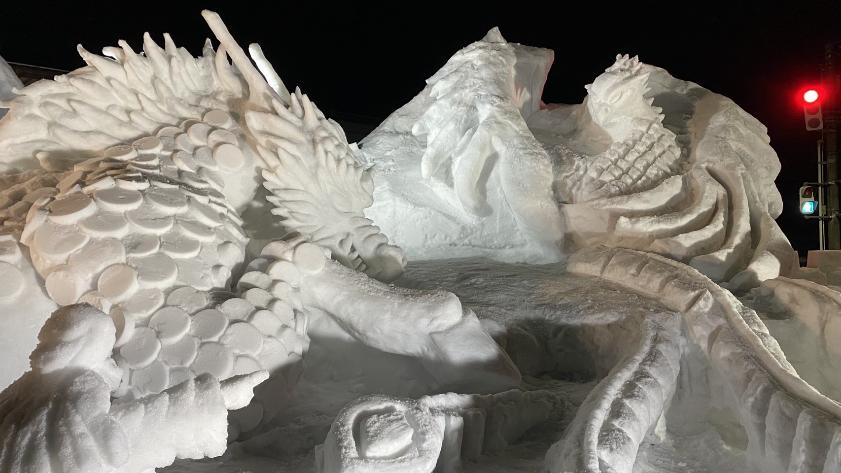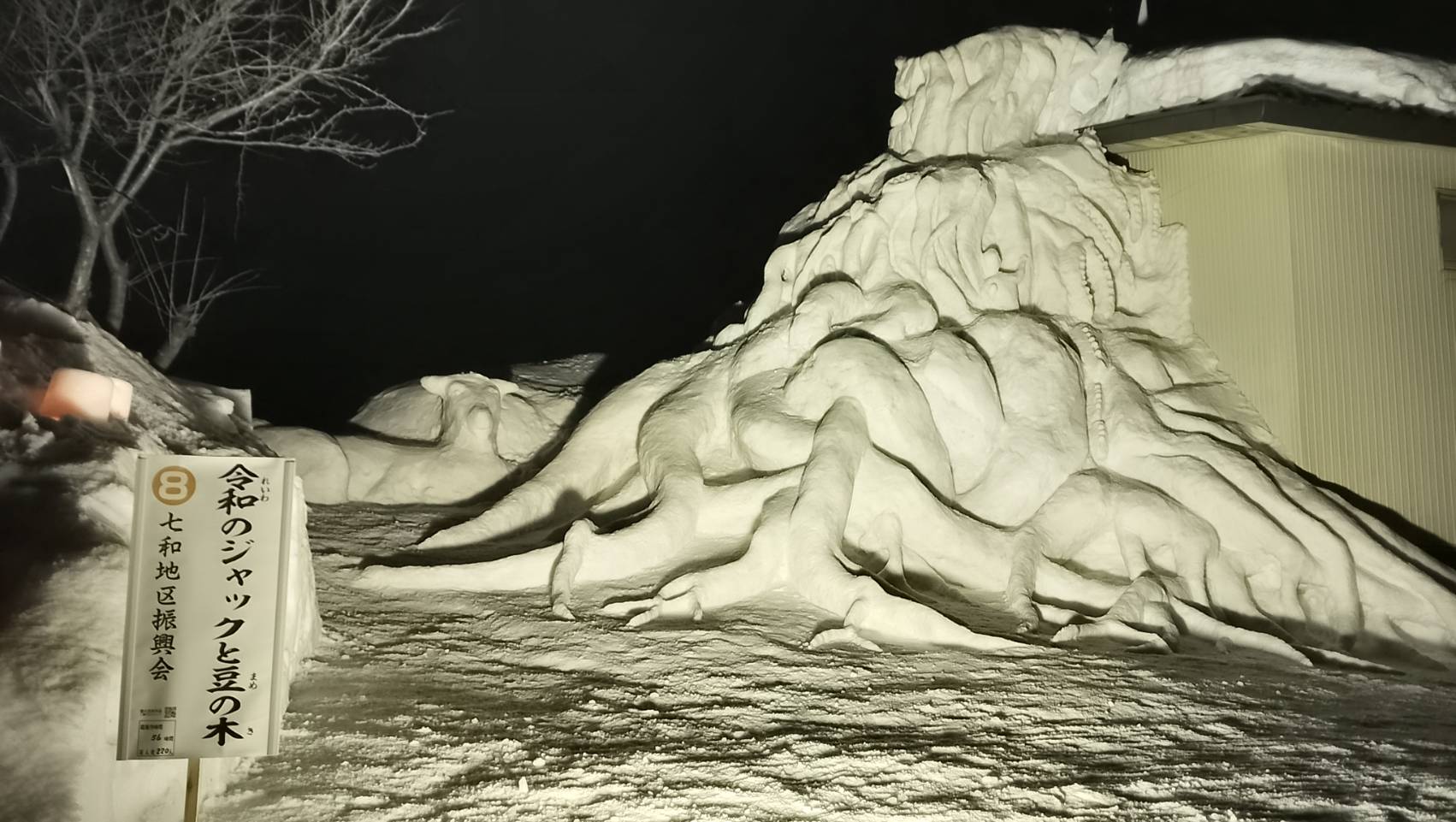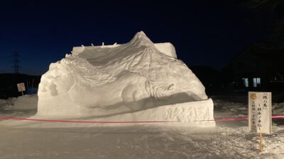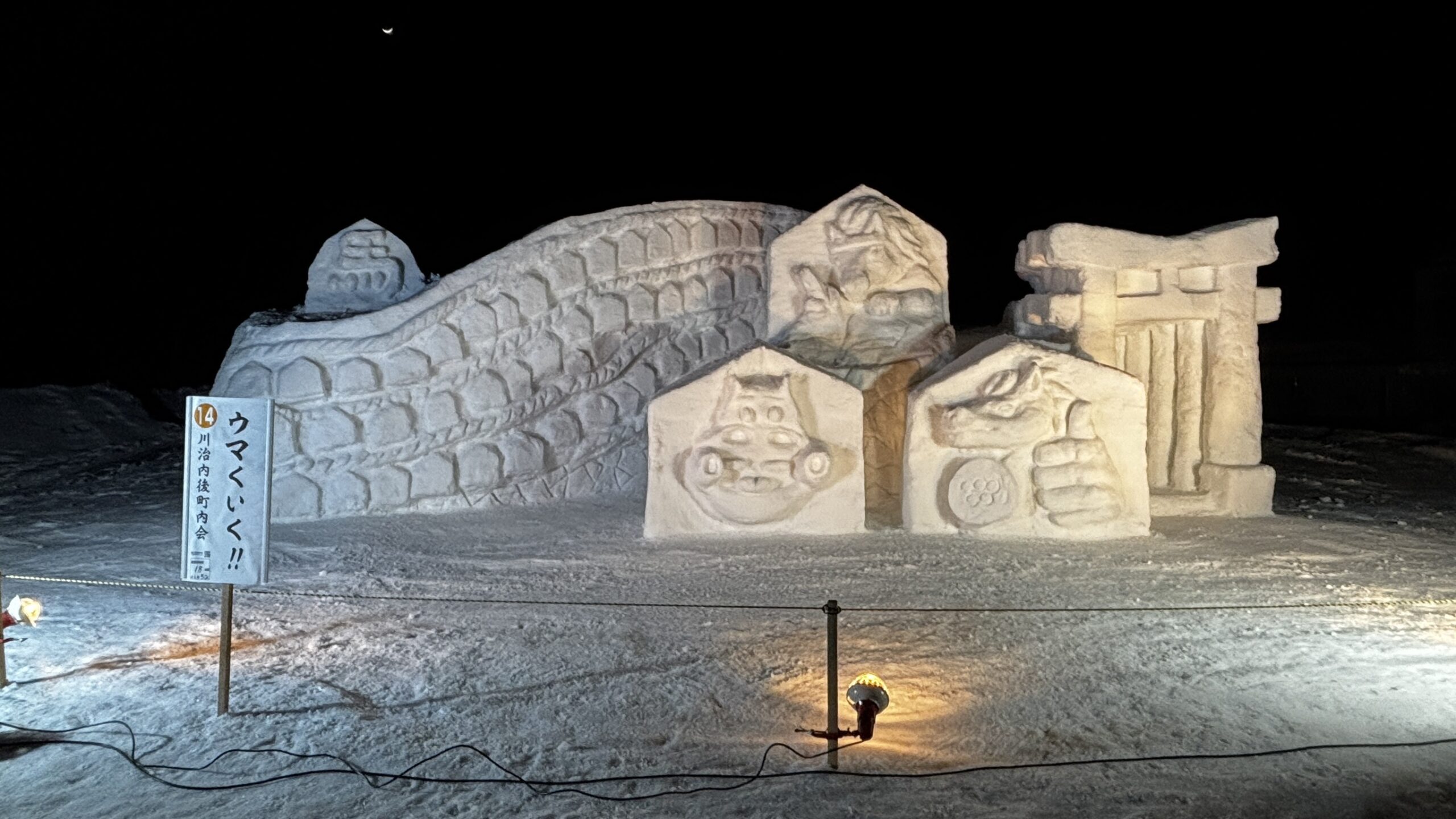 第77回十日町雪まつりが20日(金)に開幕しました。「雪の芸術作品」芸術部門の審査が夕方から行われ、審査の結果、最高賞の新潟県知事賞には北新会with新田イベント研究所の「BEYOND THE SILKROAD ~遥かなる麒麟の大地へ~」、十日町市長賞には馬っぱんしょの「馬っぱの大秘宝〝雪像王〟に!!!おれはなる!!!!」が選ばれました。北新会with新田イベント研究所の県知事賞受賞は3回連続、馬っぱんしょの市長賞受賞は2回連続となりました。