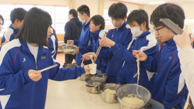 南中学校の生徒が玉垣製麺所と協力してオリジナルの「へぎそば」麺づくり