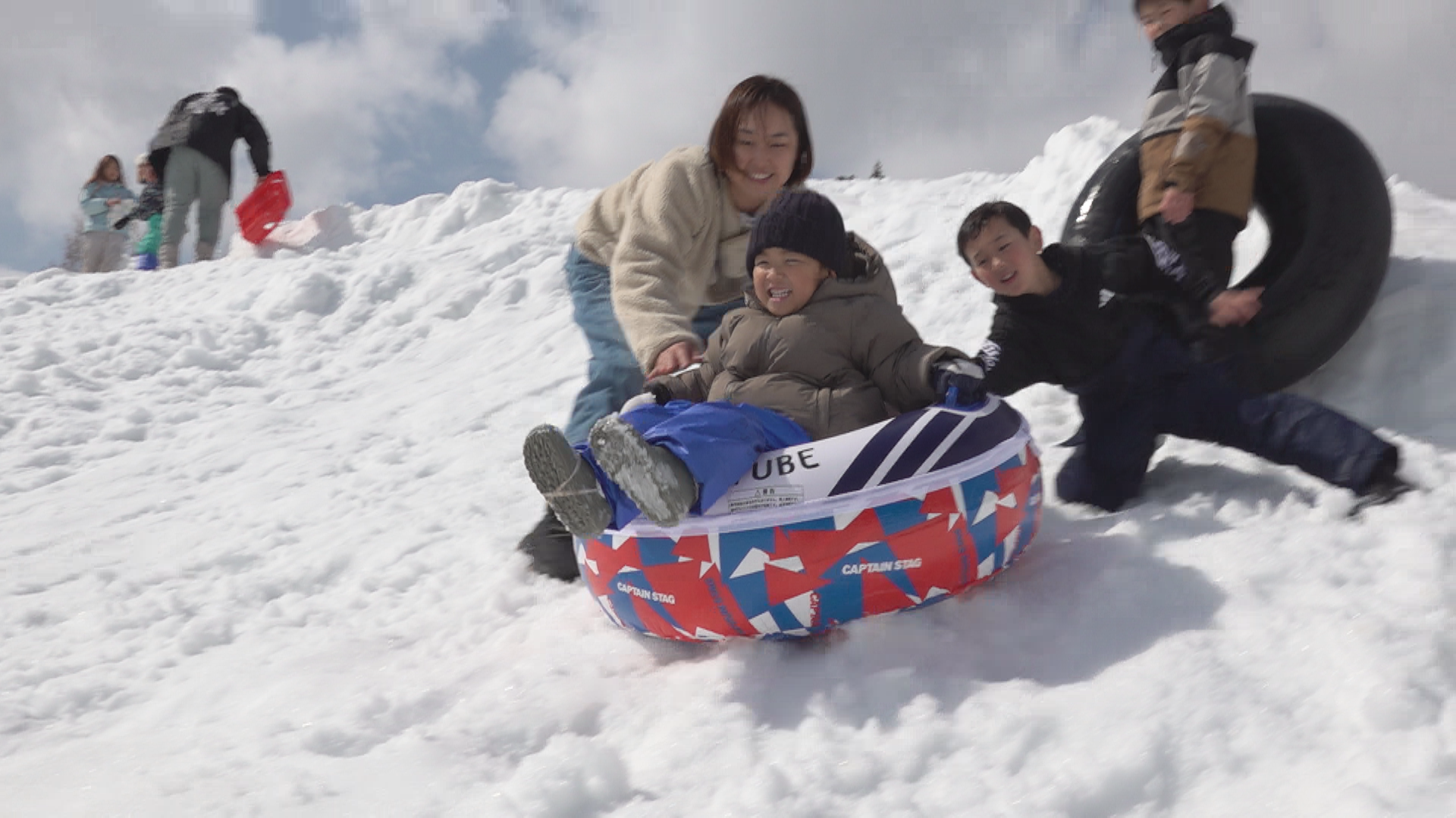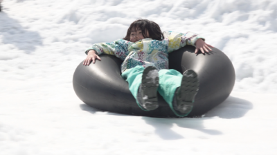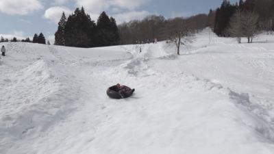 中でも子どもたちの人気を集めていたのがかつてのスキー場のフィールドを使った全長約100mのスノーチュービングです。保存会のメンバーが手作りしたコースには大きな傾斜とカーブが待ち構え、参加者はスリルと雪原の景色に歓声をあげていました。