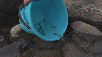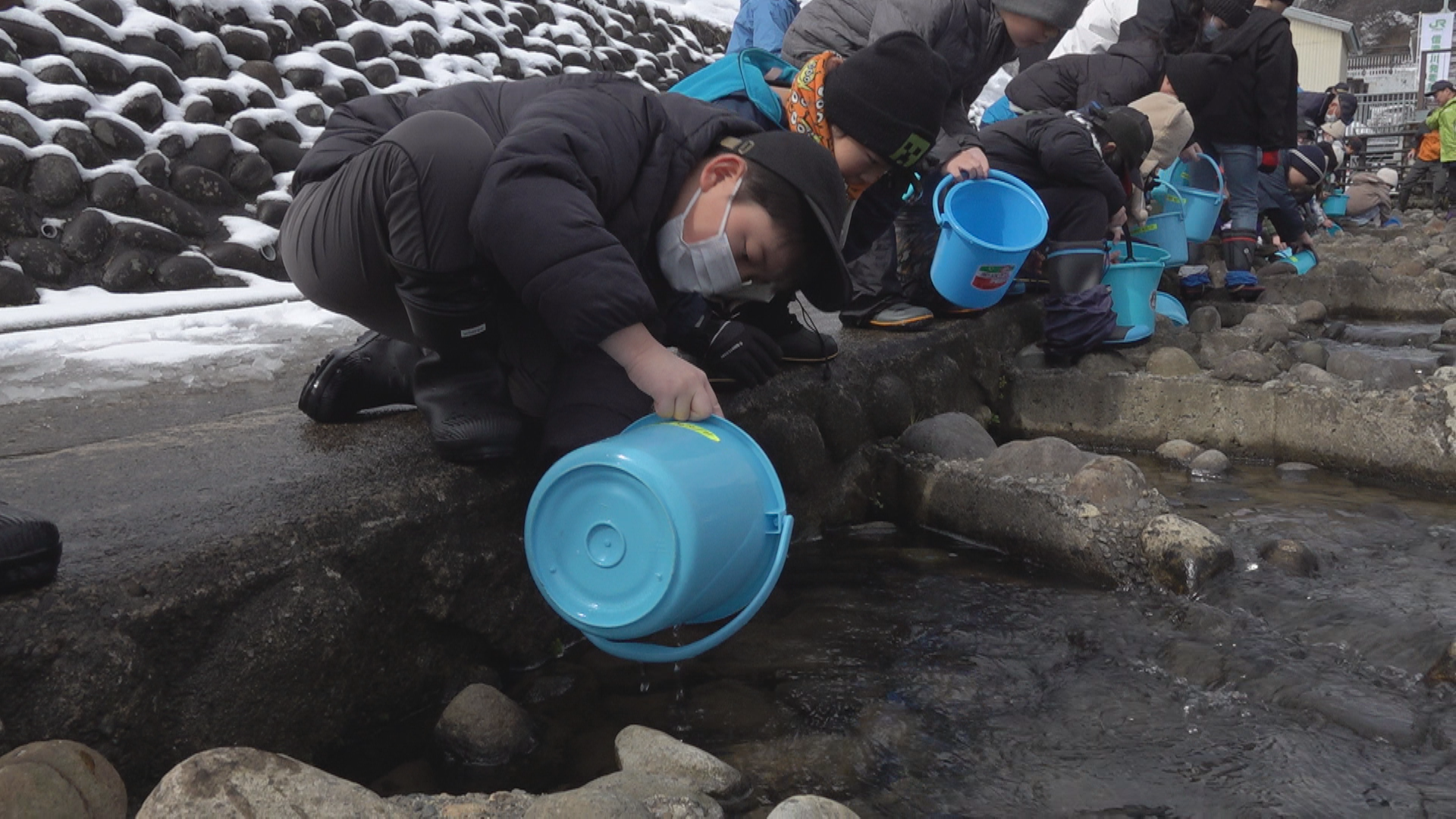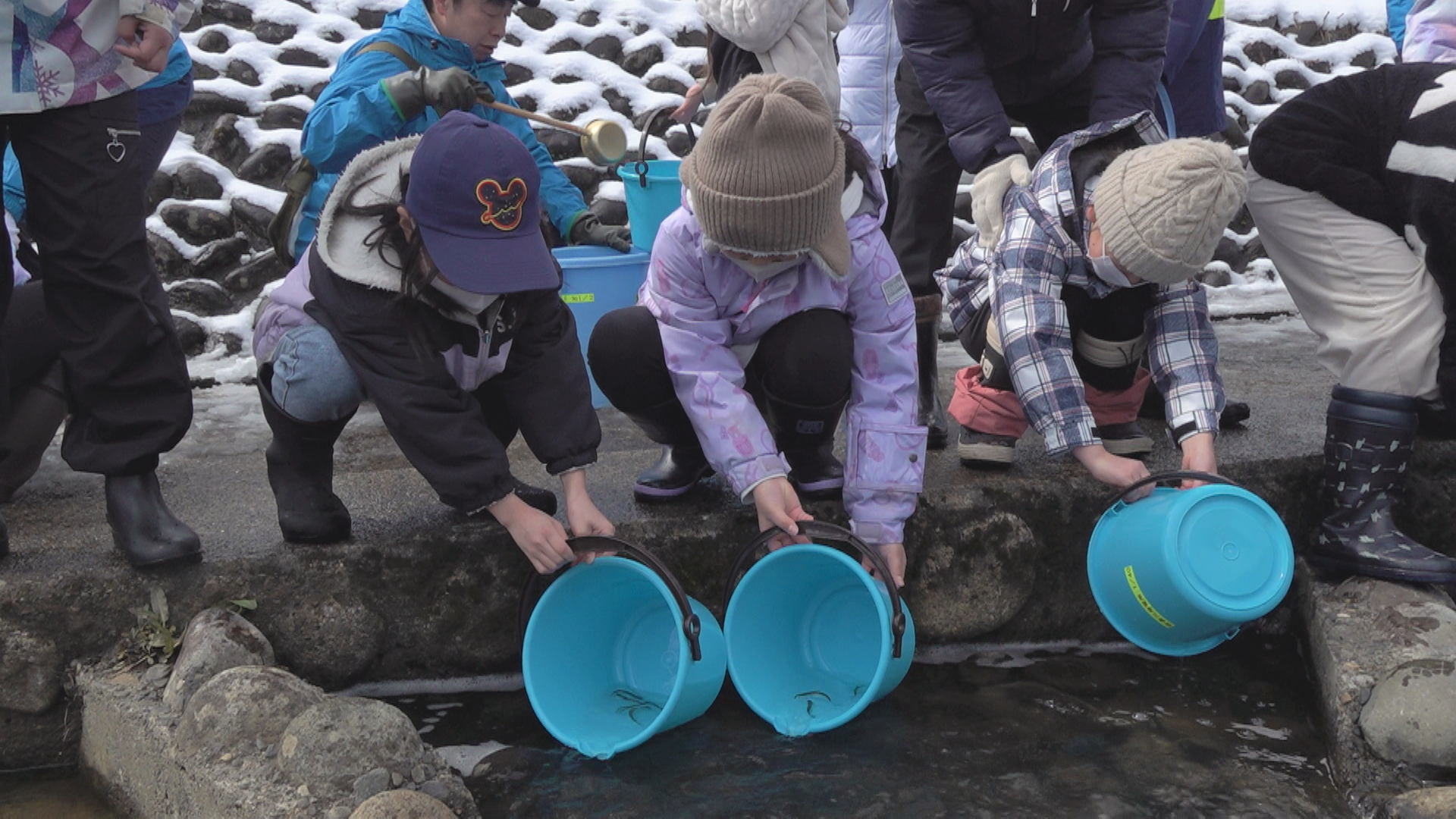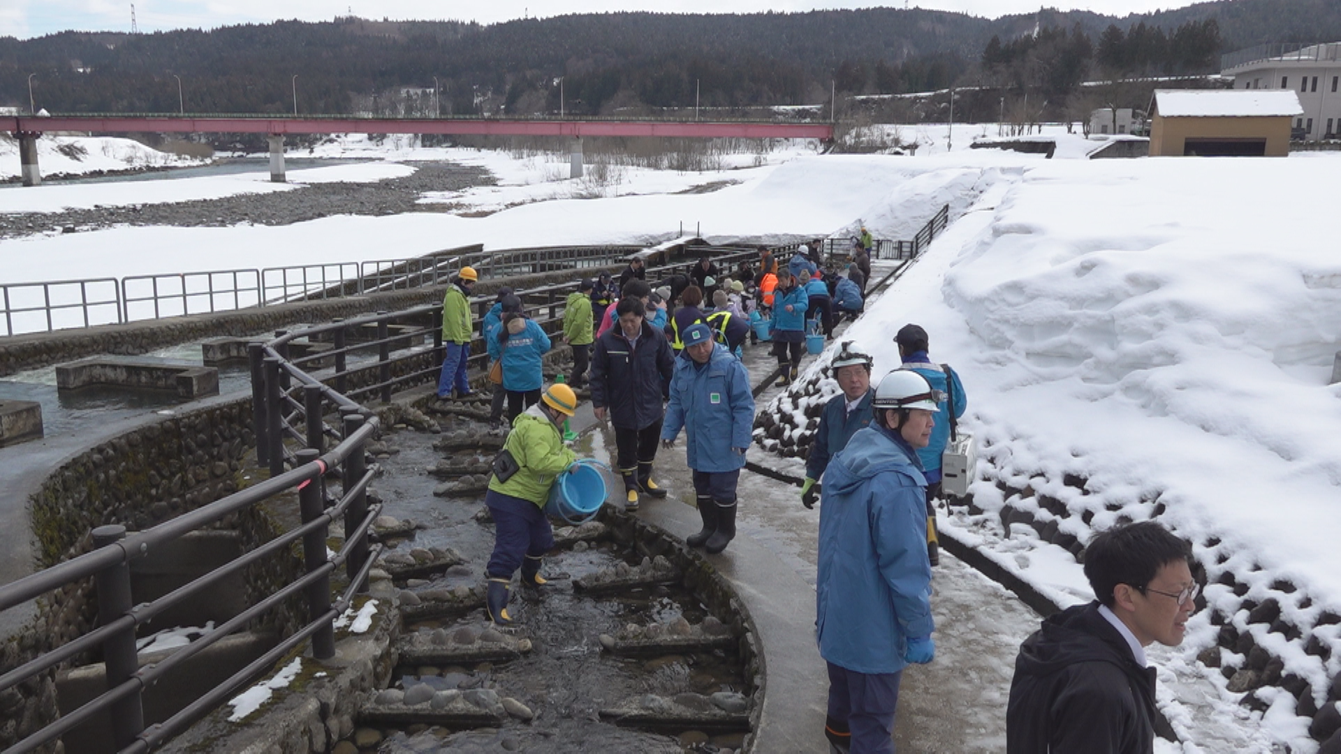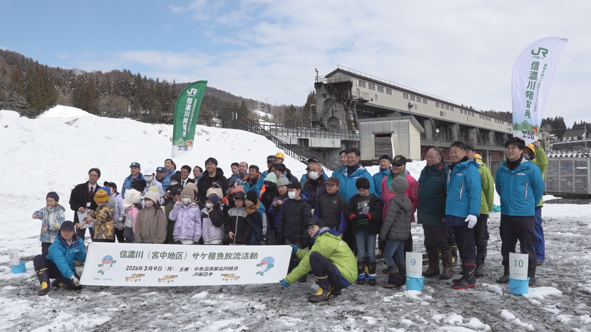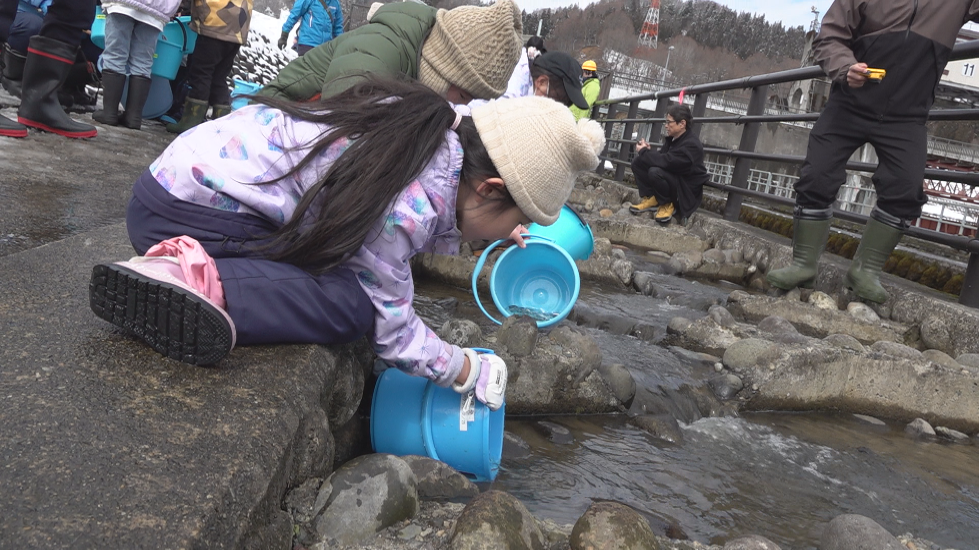 宮中取水ダムでのサケの稚魚放流は、信濃川の河川環境を守ろうとJR東日本が中魚沼漁業協同組合と行っているもので今回で17回目になります。田沢小学校の3年生30人が体長4㎝、重さ1.4gほどのサケの稚魚をそれぞれのバケツに入れてもらい、小さな魚がダムの間を移動するための「せせらぎ魚道」に流しました。