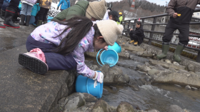 信濃川の河川環境を守ろうと宮中取水ダムのせせらぎ魚道で9日(月)、十日町市立田沢小学校の3年生がサケの稚魚を放流しました。