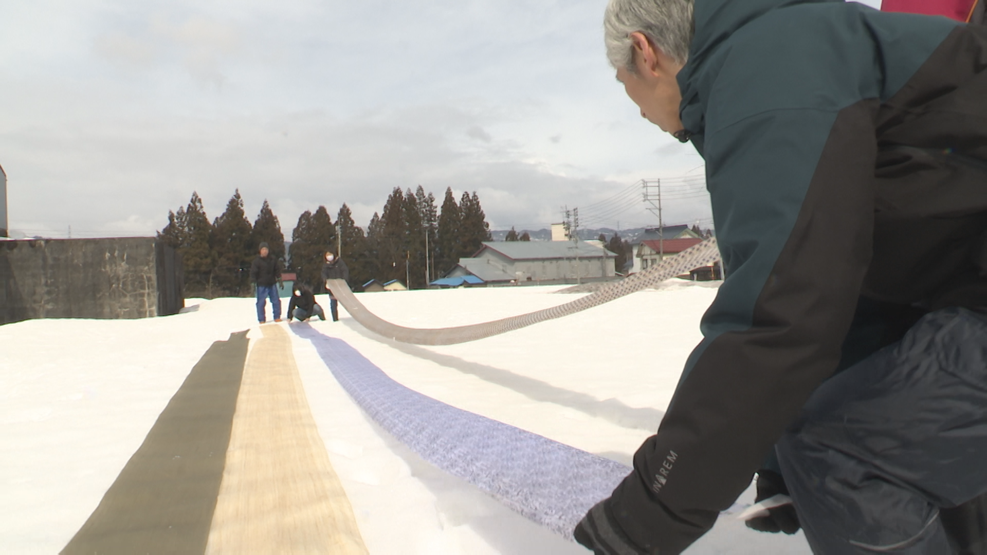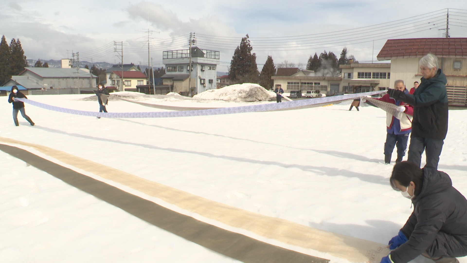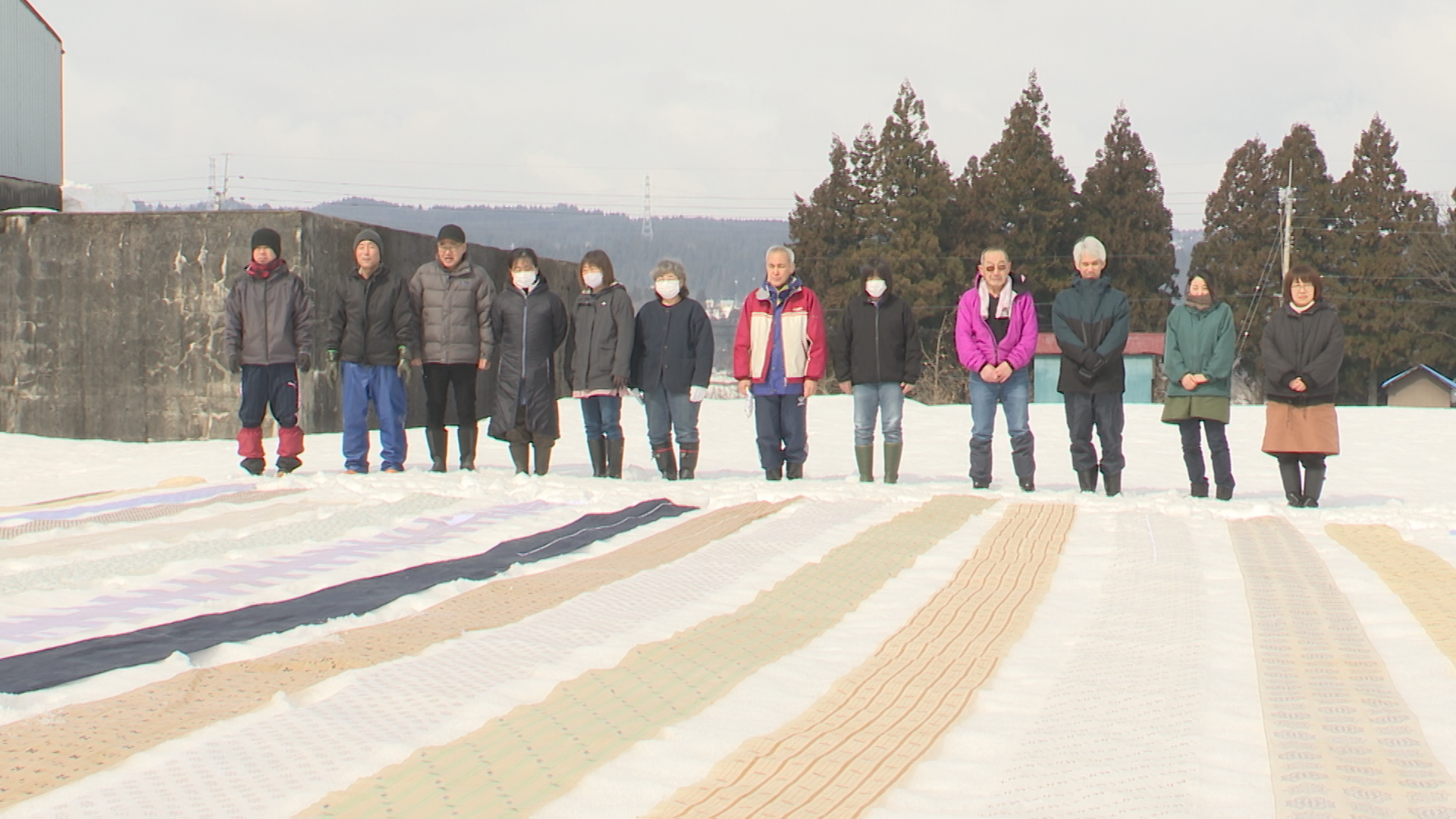 この日はシルクワークの工場隣りの空き地で従業員13人が、国の重要無形文化財にもなっている越後上布や沖縄の八重山上布など、全国から届いた依頼品16点の布を約1mほど積もった雪の上に広げました。