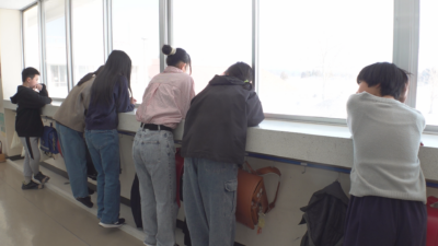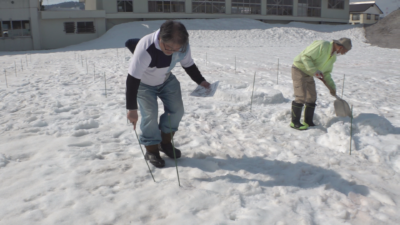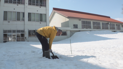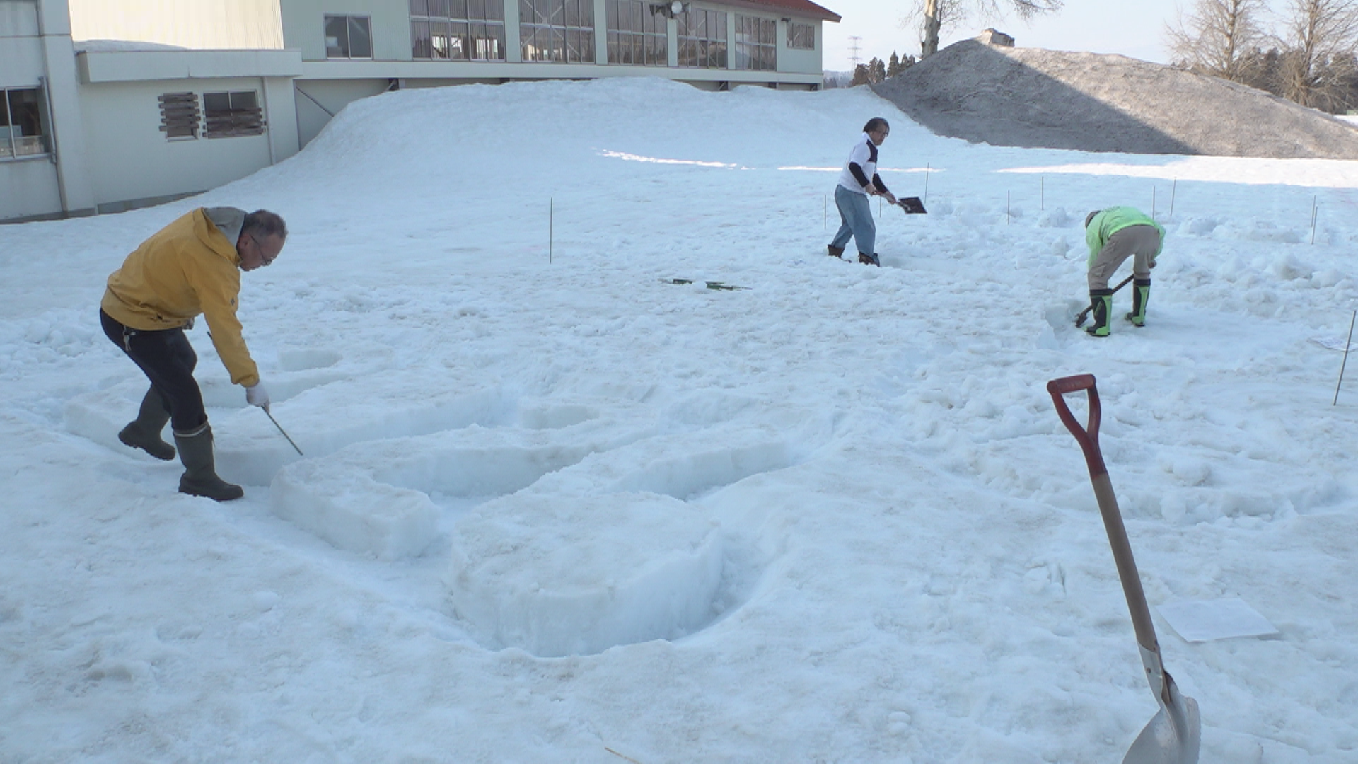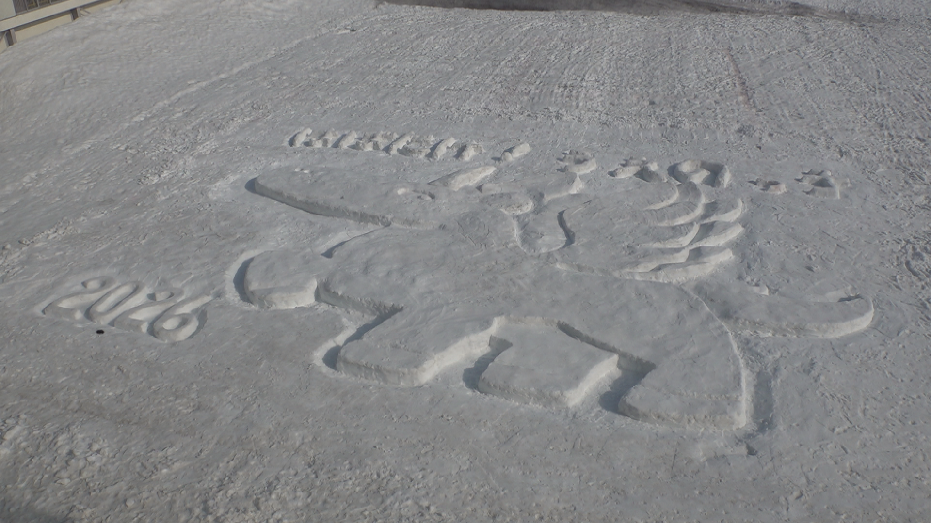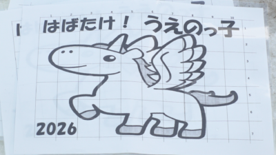 グラウンドに雪で作られた地上絵は、ことしの干支「うま」にちなんで子どもたちに親しんでもらおうとオリジナルユニコーンが描かれました。「はばたけ!うえのっ子2026」とメッセージも雪で描かれています。その大きさは縦14m、横20mです。