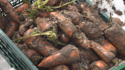 スタートの合図とともに参加者は事前に自分たちで選んだ場所へと走り出しました。20分以内に収穫したニンジンの本数で勝敗が決まります。折れたり傷がついたニンジンはカウントされません。参加者は協力しあって畑に1mほど積もった雪をかき、ニンジンを掘り起こしていました。