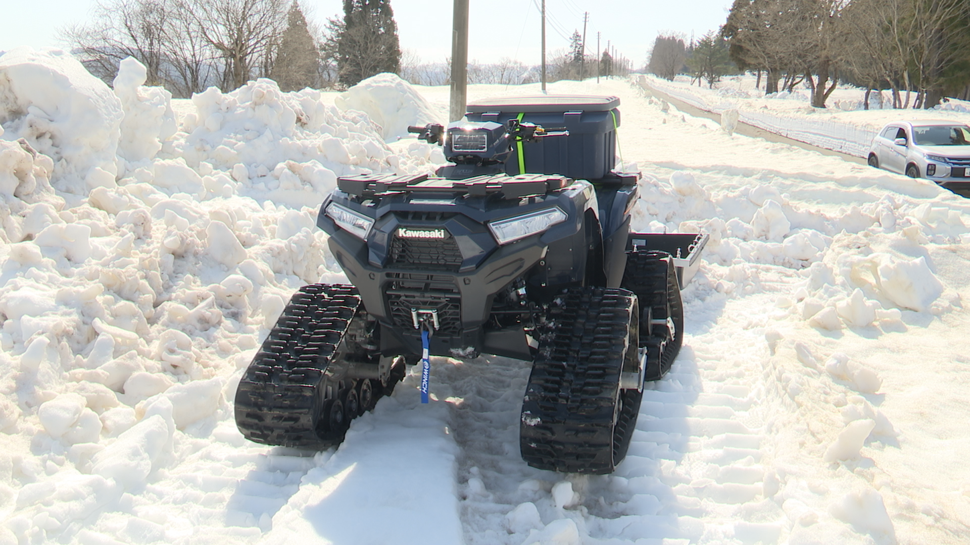 東北電力ネットワークでは停電事故を未然に防ごうと、電柱や電線などの配電設備が樹木に触れたり、損傷がないかを調べる目視による巡視を定期的に行っています。冬の間、積雪によって車が通れない山間部での巡視や復旧作業で活躍するのが雪上バギーです。バギーは雪の上を走りやすいようにキャタピラーを装着し、車体の後ろに作業員や物資を運ぶためのソリが取り付けられています。