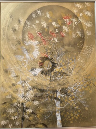 今回の作品のタイトルは「季縁(きえん)」。巡る季節を1枚の絵に表現しようと春の「舞う桜」、夏の「表裏がある白と黒のひまわり」、秋の「彼岸の曼珠沙華」、冬の「白い枯木」を表現しています。庭野さんの作品はすべて太陽か月を作品の中心に置き、十日町で見られる光景をキャンバスに描くスタイルで、今回の作品は十日町雪まつりのあと、制作に取り組んだ新作です。