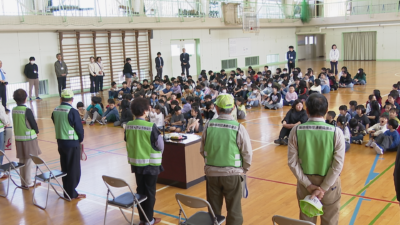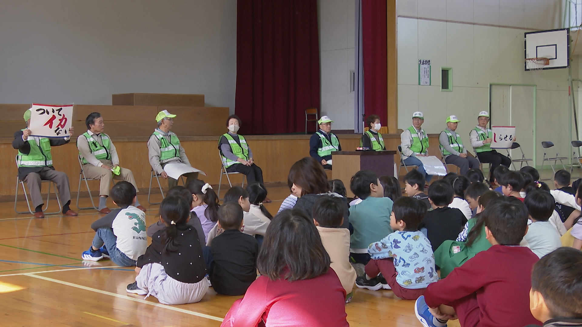 年度初めの顔合わせ会では14人のメンバーが全校児童239人に自己紹介をして、見守りのときに立つ場所を伝えました。そして、子ども見守り隊の鈴木龍次隊長から「知らない人についてイカない」「他人の車にのらない」「大声を出す」「すぐ逃げる」「何かあったらすぐ知らせる」の5つの言葉をまとめた防犯標語、「イカのおすし」が伝えられました。